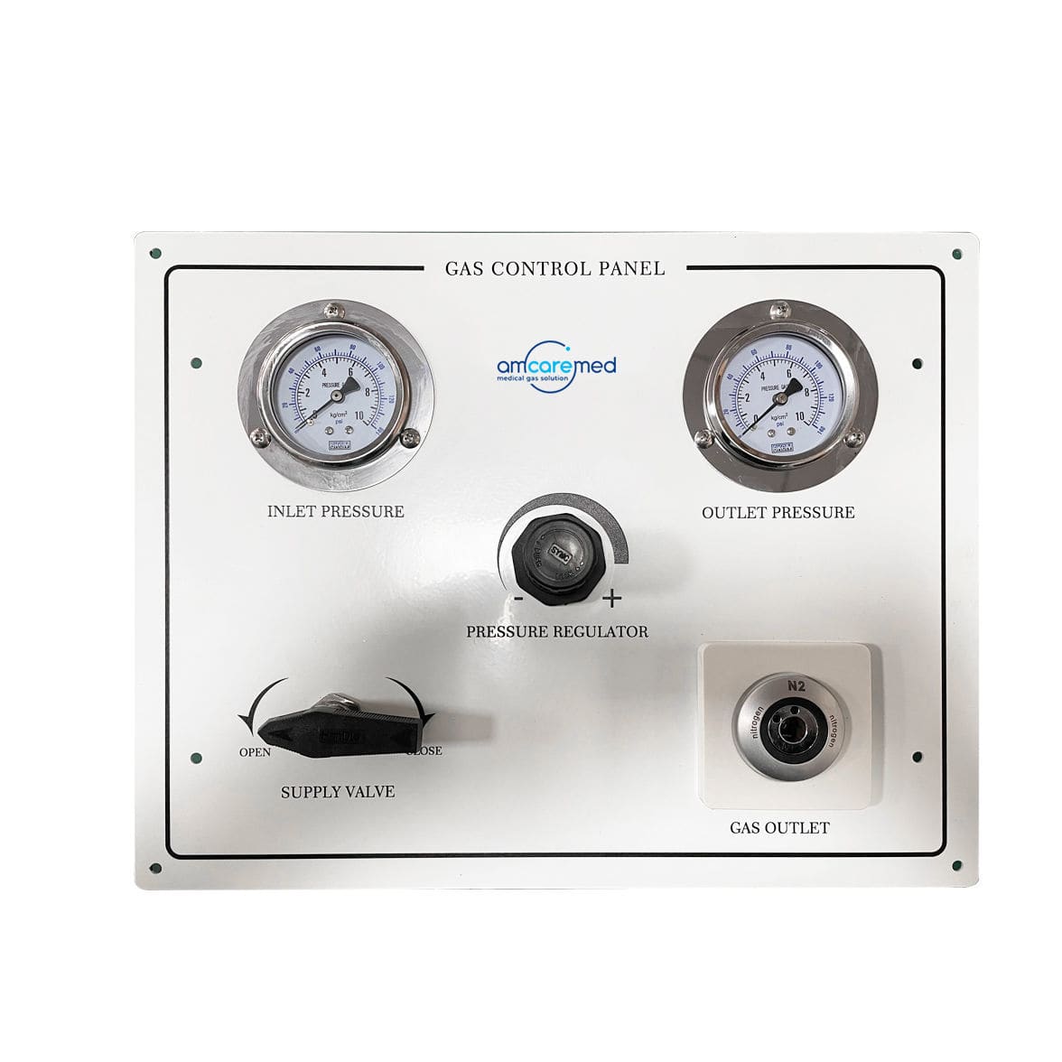 AmcareMed medical gas control panel has a pressure regulator in the center that allows the medical staff to adjust the output pressure and thus control the pressure delivered to the instrument.