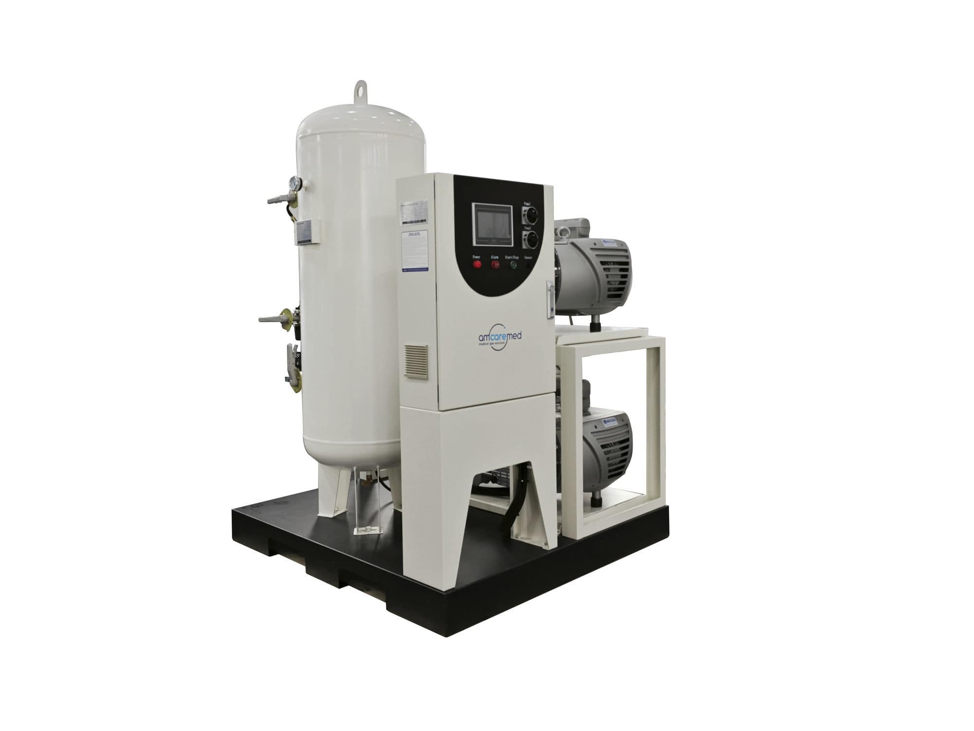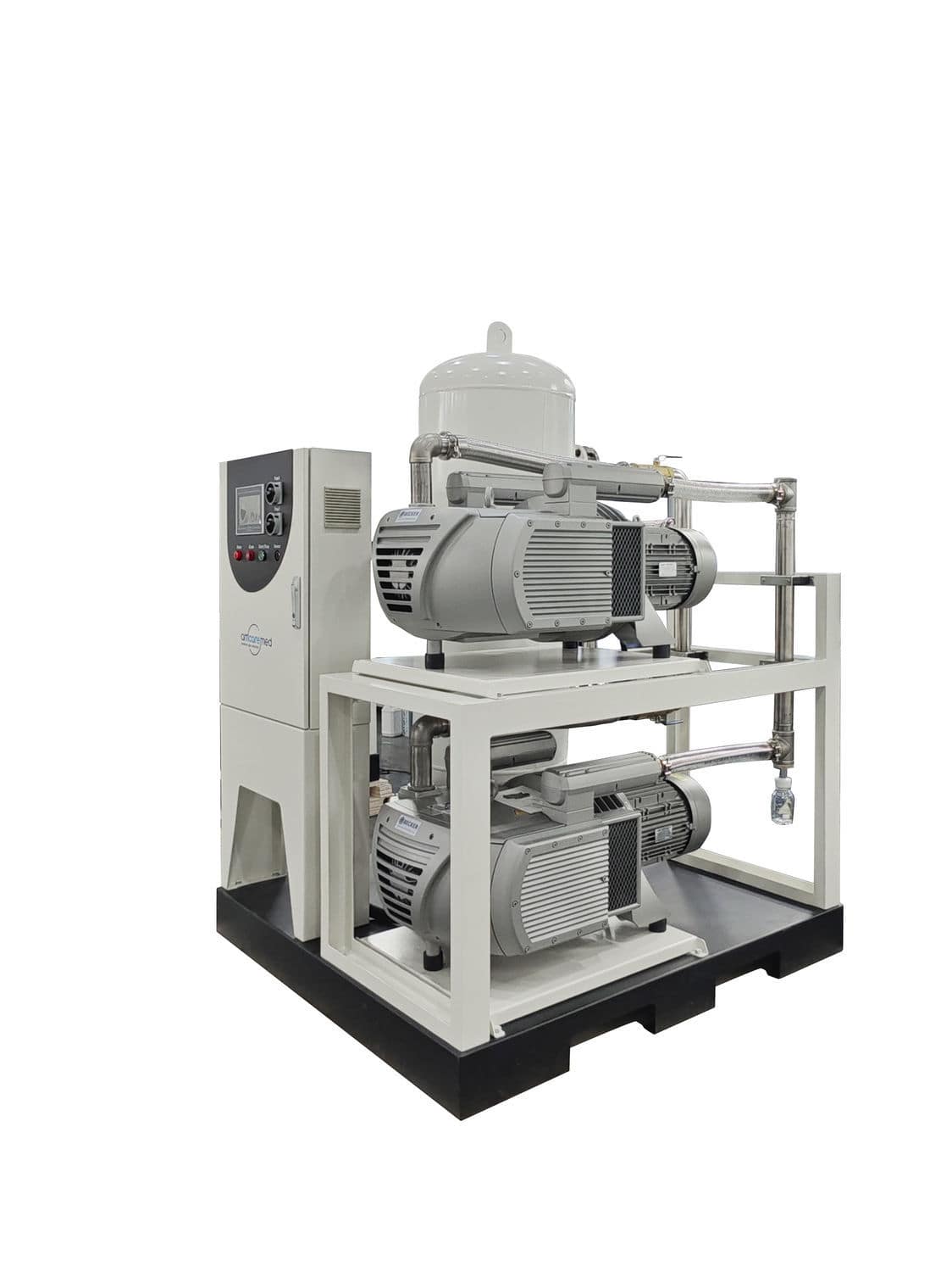 AmcareMed medical rotary vane vacuum pump system fully meets ISO 13485 and ISO 7396 standards, equipped with multiple vacuum pumps, a receiver tank, and a control panel.