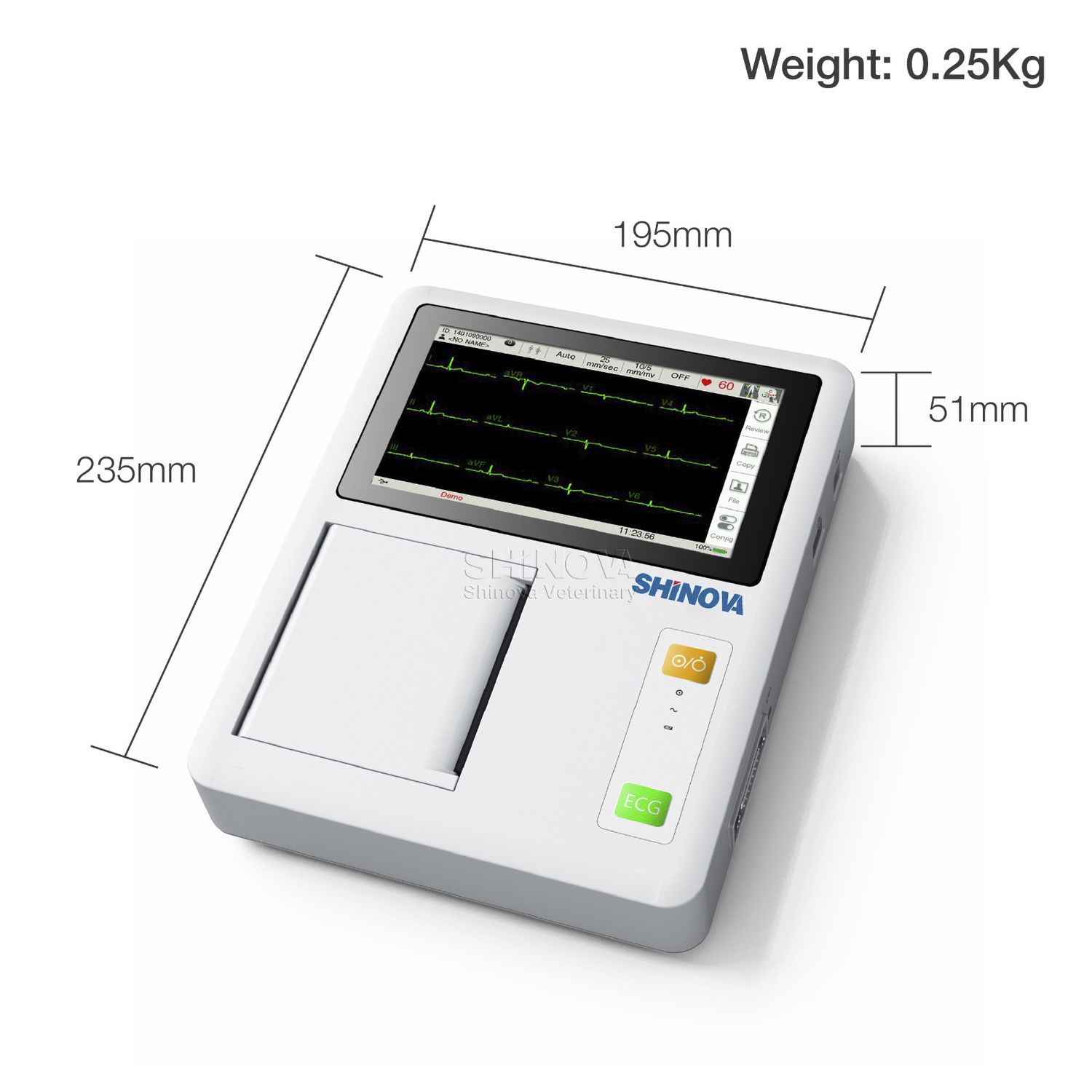 Veterinary 5-lead clip ECG cable, Recording paper (roll 80mm*20m), Paper roller, Power cord, Fuse, Ground cable, User manual.