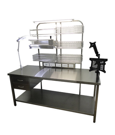 Mounted on adjustable feet. This table is manually or electrically height-adjustable. The accessories include a table lamp, a lamp with magnifying glass, trays, roll-holder with cutter and shelves.