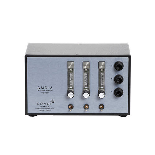 The Somni AMD-3 accurate multiple delivery is a flowmeter controlled diverter system that is adaptable to any standard Inhalant Anesthesia System. It can be added to Somni’s TT-2 or any other non-pressurized system. The AMD-3 gives the user the ability to delivery accurate flowrates to 3 stations simultaneously. No more guessing if the flow is being delivered equally to multiple devices at once. With its included pressure relief valve the user does not have to worry about pressure building up in the vaporizer. 3 fresh gas common outlets supplied with color coded tubing makes this system very user friendly.