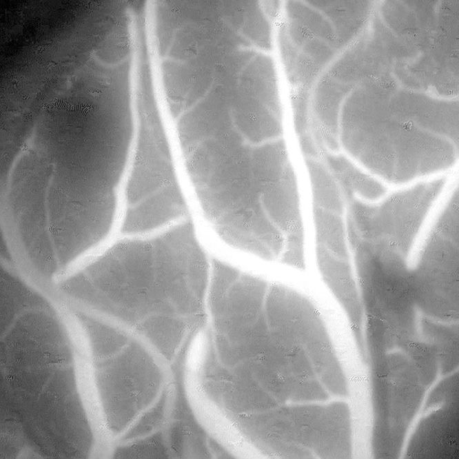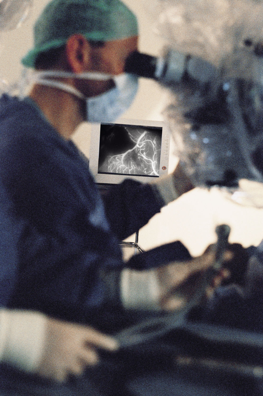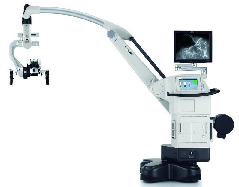 During surgery, the patient is injected intravenously with ICG (indocyanine green) dye, which is well tolerated and spreads quickly. A near infrared camera then shows the bloodstream in black-and-white directly through the surgical microscope eyepieces and/or on a video monitor.