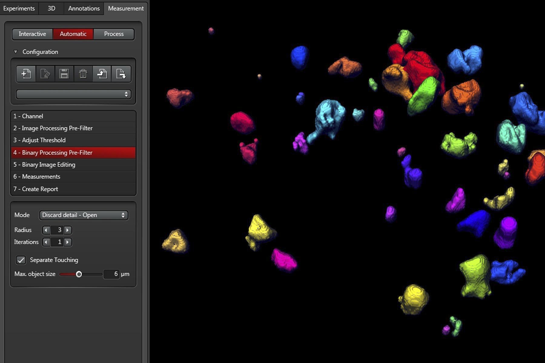 The 3D Analysis wizard helps you obtain key data from your sample. It guides you through the analysis process and offers a large selection of filters, a segmentation tool with optional automatic threshold determination and binary filters. 3D objects also can be combined or separated manually. Key data to be obtained are volume, filled volume, voxel count, surface area, filled surface area, diameter, many shape and intensity parameters as well as object position plus statistics for all supported features.