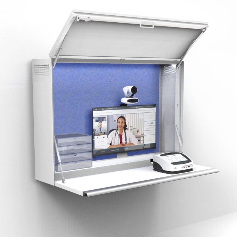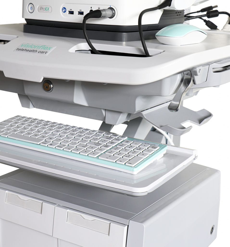 The telehealth cart is an innovative, ergonomic and easy-to-manoeuvre medical cart that features sit-to-stand adjustment, independent screen positioning, side-to-side keyboard motion and an adjustable back-tilt keyboard tray.