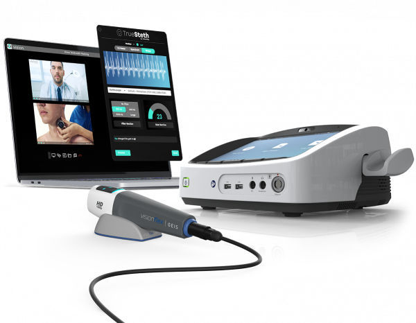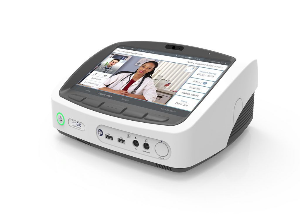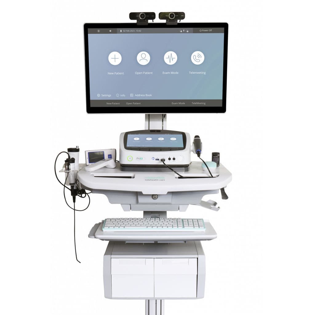 The all-in-one telehealth cart solution features a ProEX Desktop, an AIO medical-grade computer, and an ergonomic, easy-to-manoeuvre medical cart.