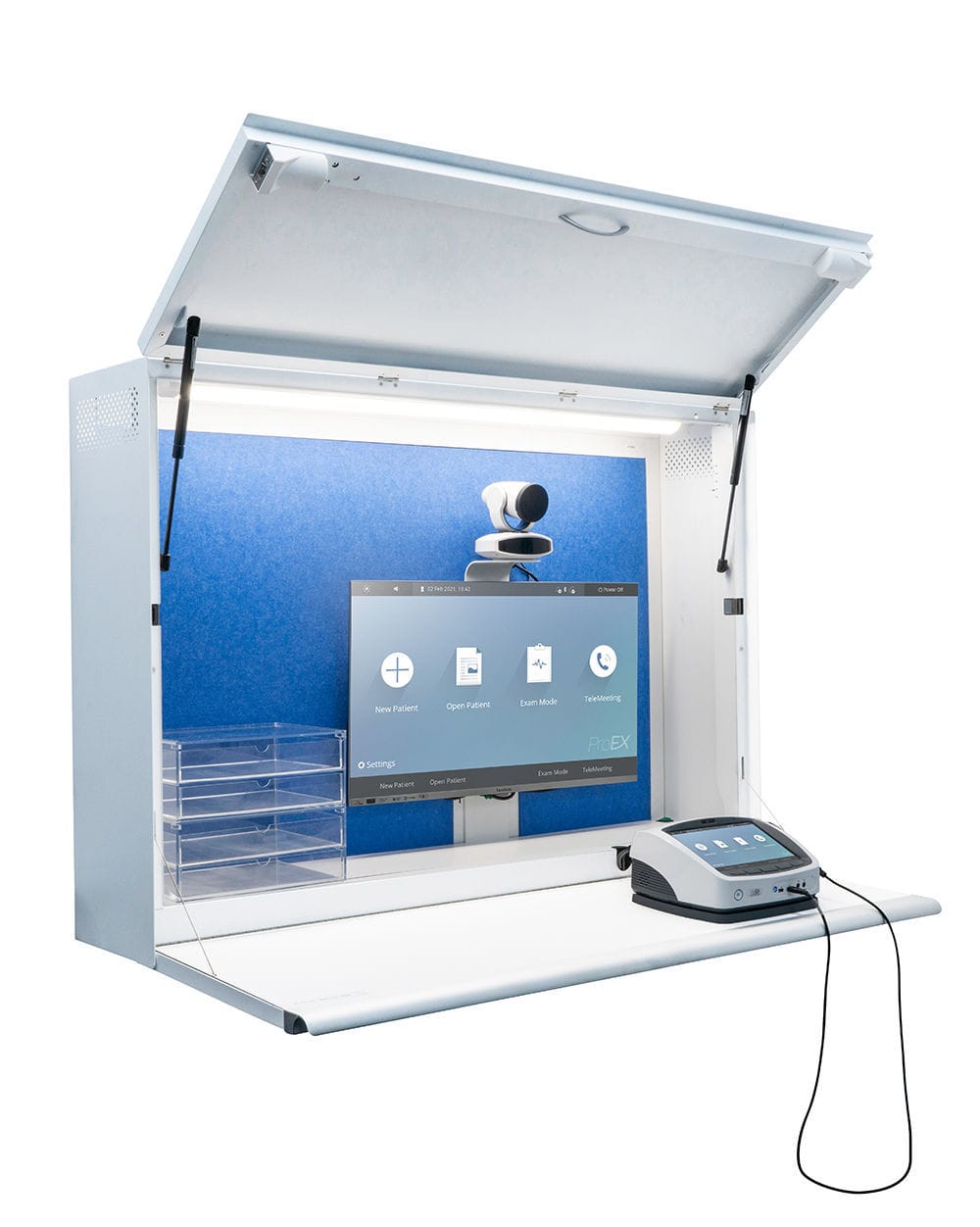 All equipment is prewired, so the cabinet need only be opened and powered-on before use. The PTZ camera and monitor are perfectly positioned to provide a user-friendly interface to the remote physician.
