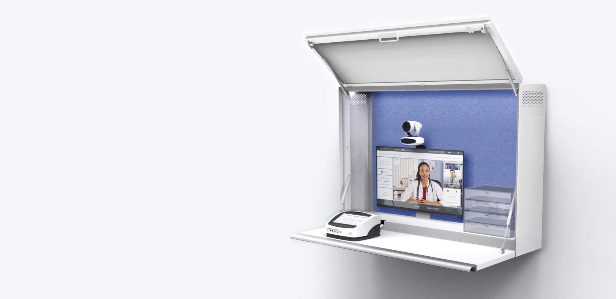 The Telehealth Cabinet provides an excellent workspace with integrated LED illumination and a fold down front door which converts to the perfect work surface while the cabinet is in use. All doors on the Telehealth cabinet are connected with gas struts to guarantee smooth and simple operation while opening and closing the cabinet.