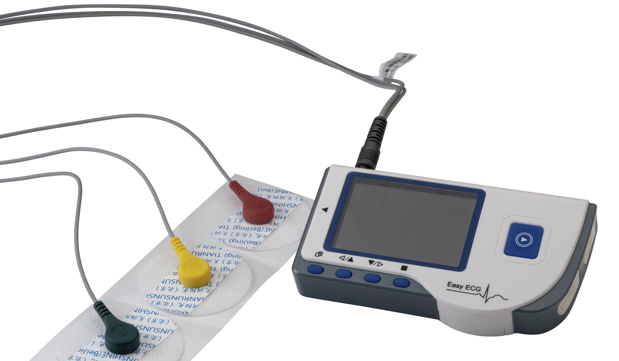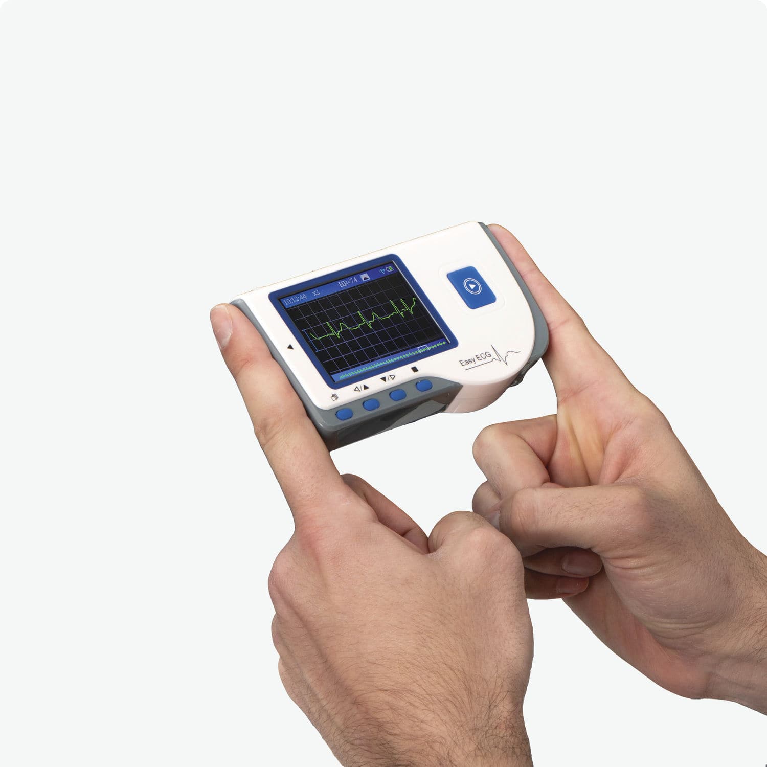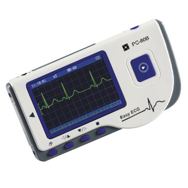The portable ECG machine is easy to use and monitors heart rates extremely accurately in ‘single wire’ or ‘three wire’ mode. In ‘single wire’ mode, the patient holds the device with two hands using the metal contact pads on each side of the housing to make the electrical connection through the body and to generate a single trace and an average heart rate on the display. The ‘three wire’ mode, generates a ‘combined’ single trace and is used with 3 adhesive ECG pads and leads connected to the device for continuous measuring.