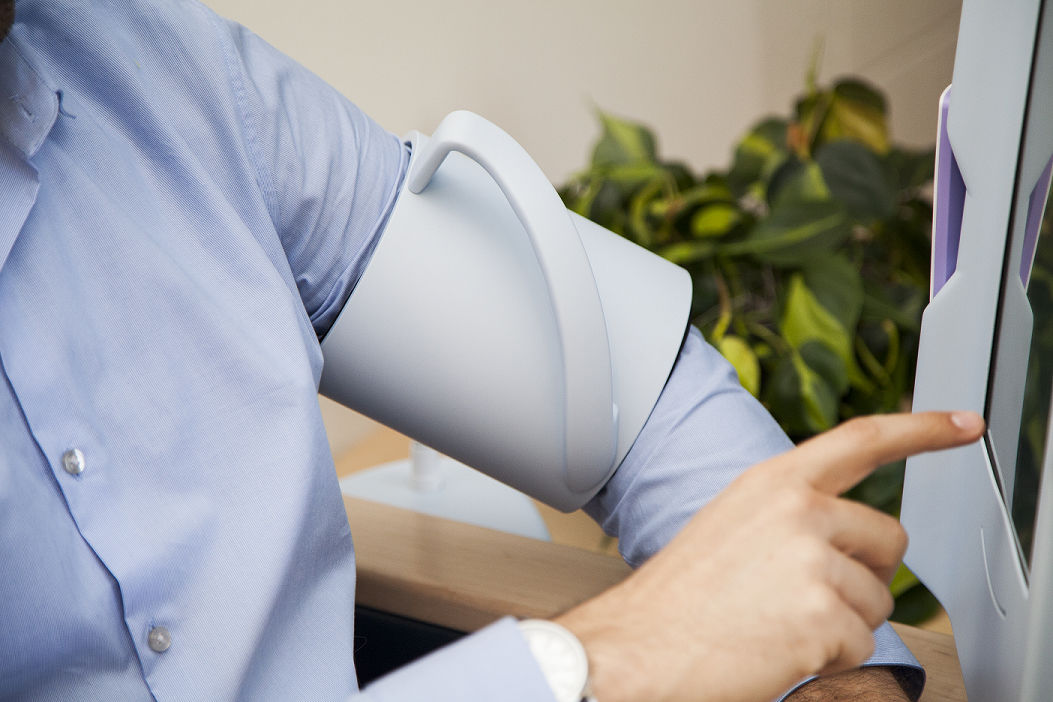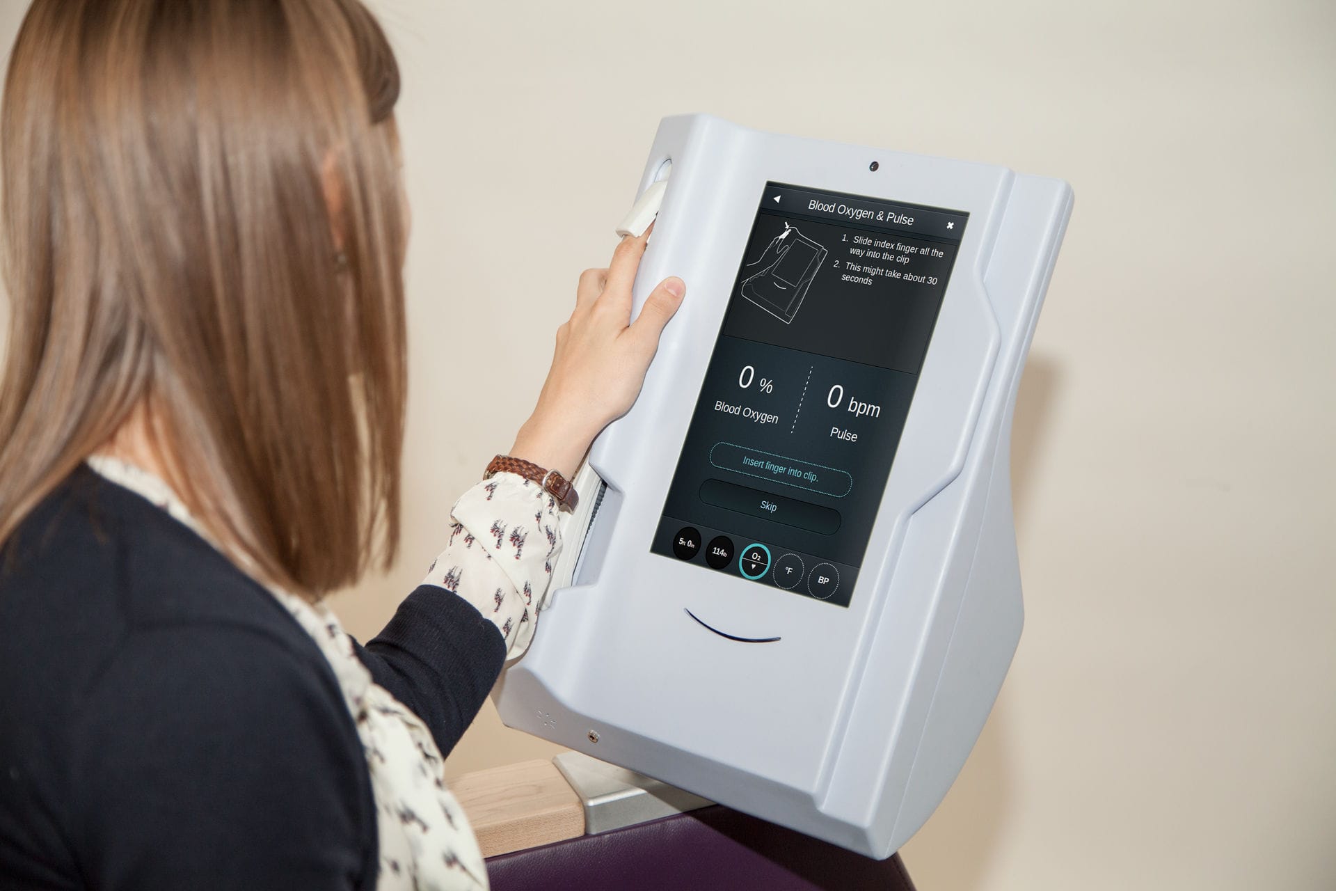 The Vitals Chair offers individuals a comfortable and accurate way to measure their own vital signs. Users self-report their height and then self-measure their core temperature, blood pressure, weight, and blood oxygen saturation using an integrated set of devices. The chair will then print a receipt of the users measurements.
