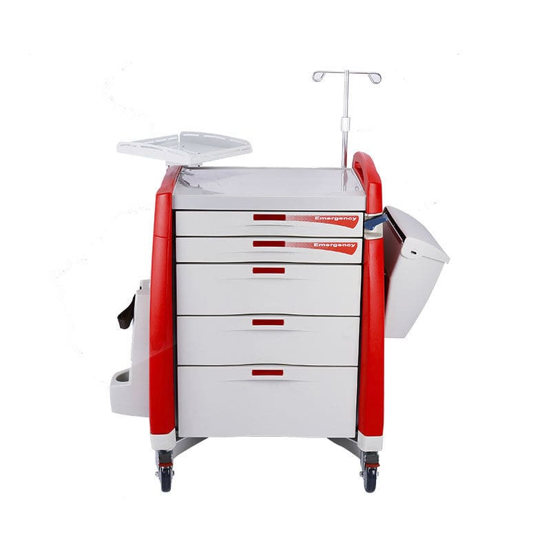 Standard Accessories: defibrillator shelf, sliding side shelf ,IV stand, two trash cans, flexible material storage, needle disposal holder, hand soap holder