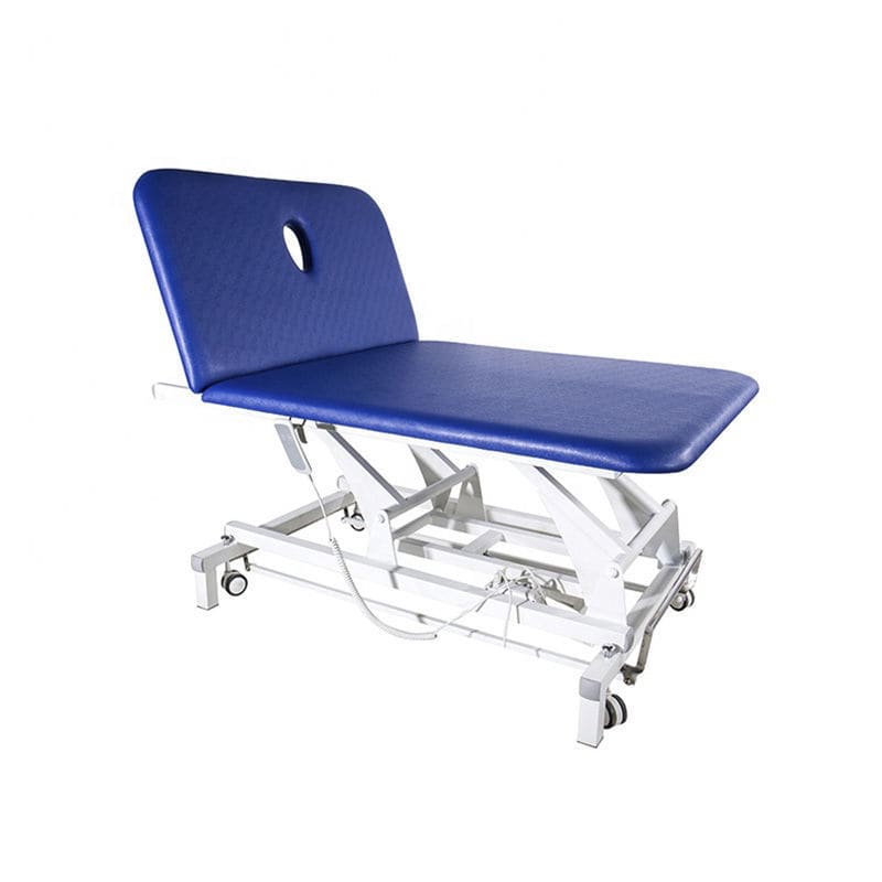 Main features - Steel reinforced frame - System of retractable wheels that activate or deactivate through a pedal - Height adjustment through an electric motor with hand control - Backrest with adjustable inclination (45º) and with facial hole - Artificial leather upholstery of high quality and resistance, with high density padding - Maximum load capacity of up to 220 Kg