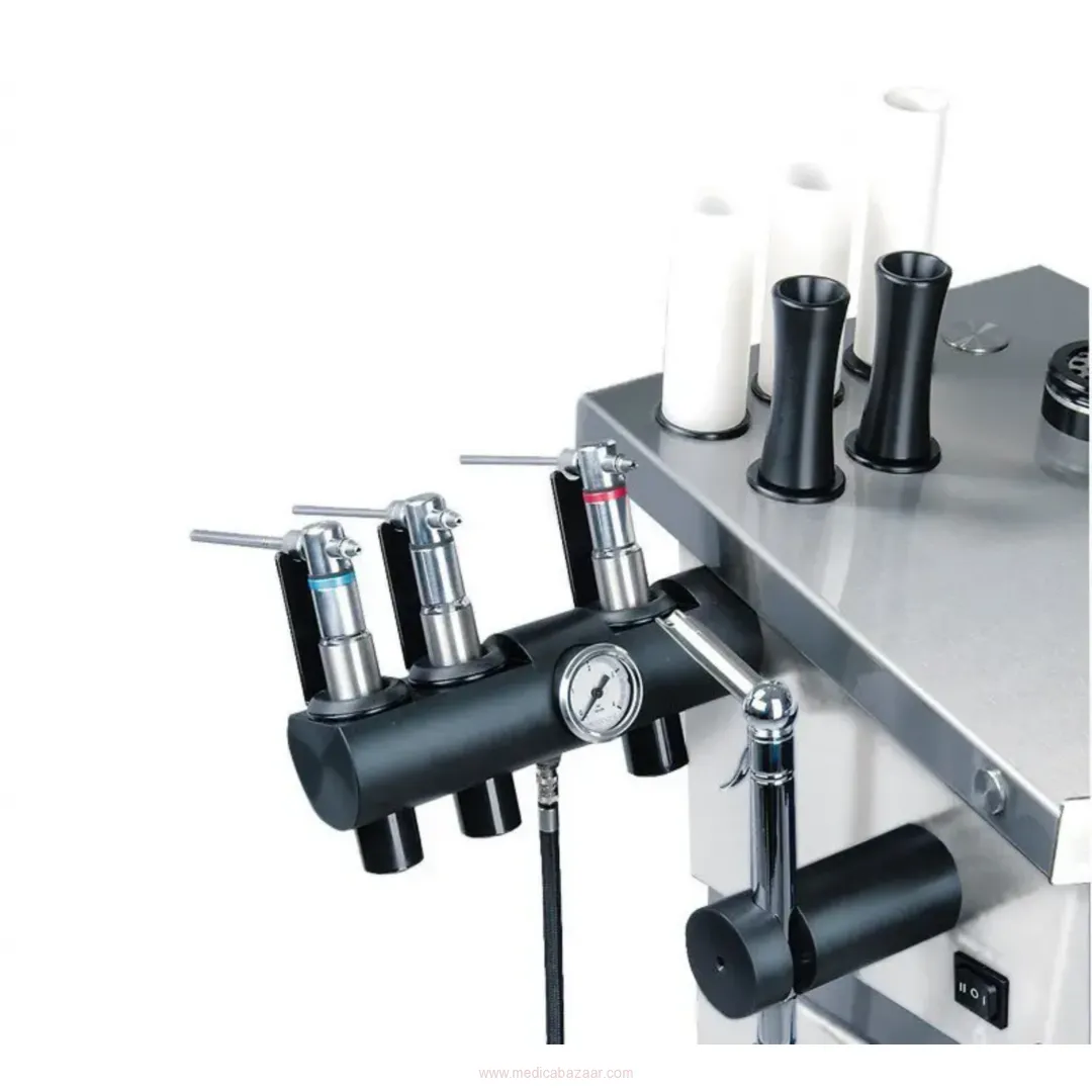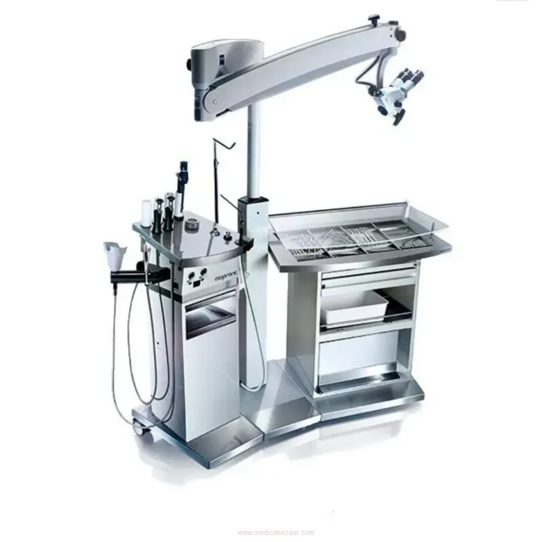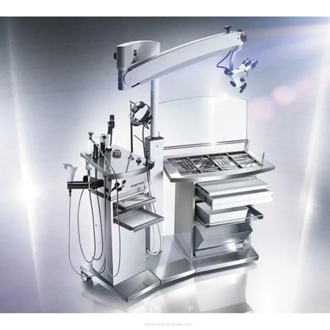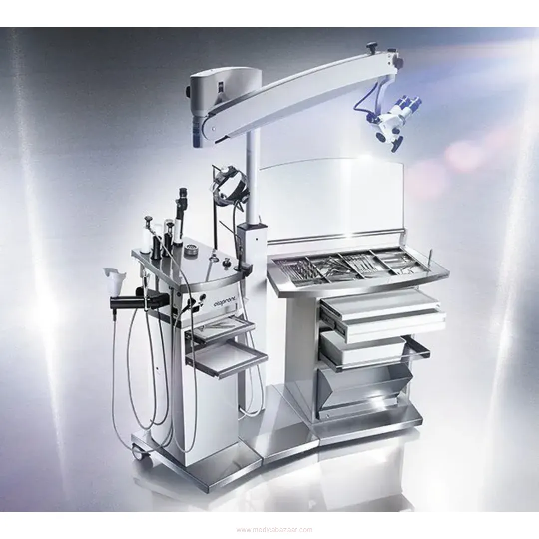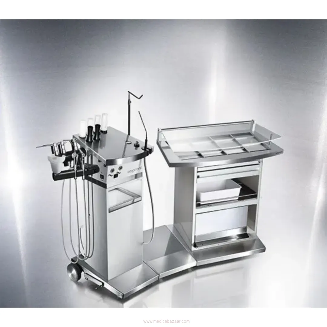 Thanks to a space-saving arrangement of all components the SMART can be fully equipped: vibration-free high performance surgical suction unit for 24-hour use, hot water with rinsing, compressed air unit, up to 3 automatically switching LED light sources, integration of RF or endoscopy systems and microscopes.
