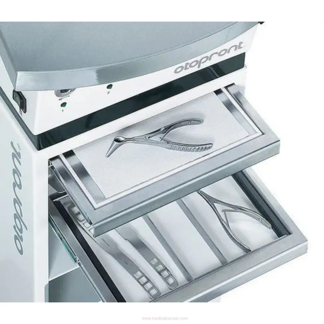 Despite its compact size all well-established Otopront standards are part of the SMART unit - such as to be pulled out stainless steel instrument trays with integrated tissue dispenser.