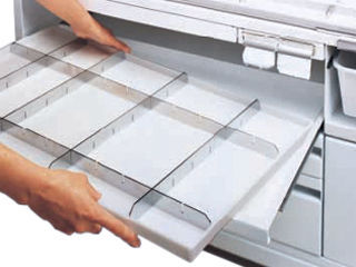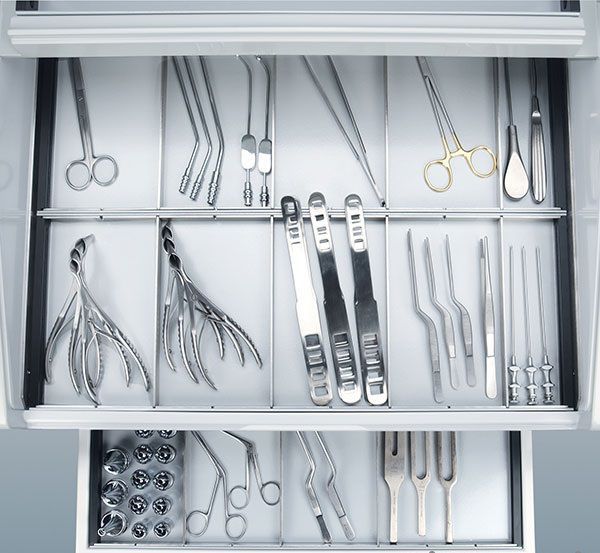 With one simple manipulation, the instrument tray can be taken out and cleaned. Even during consulting hours a refill of instruments through exchange of inserts is quickly made. The instrument tray is equipped with stainless steel organizers for instrument compartments.