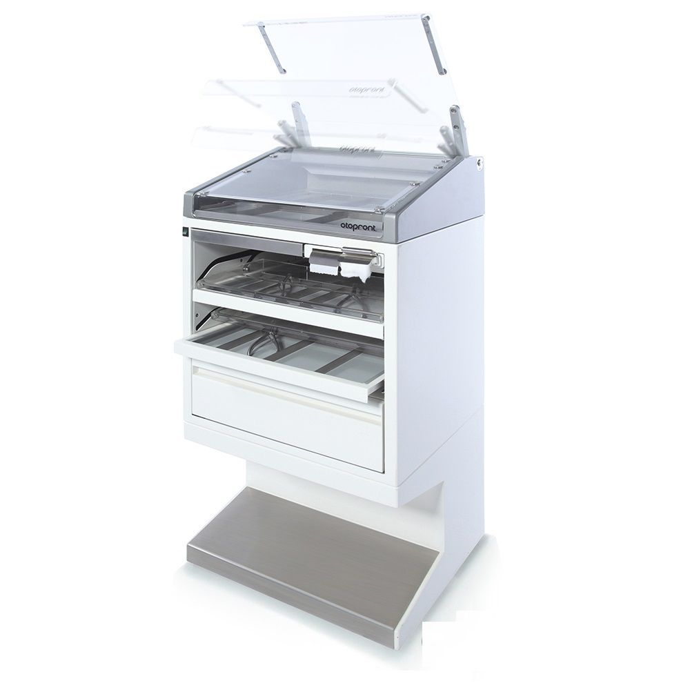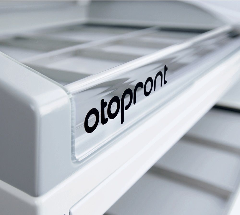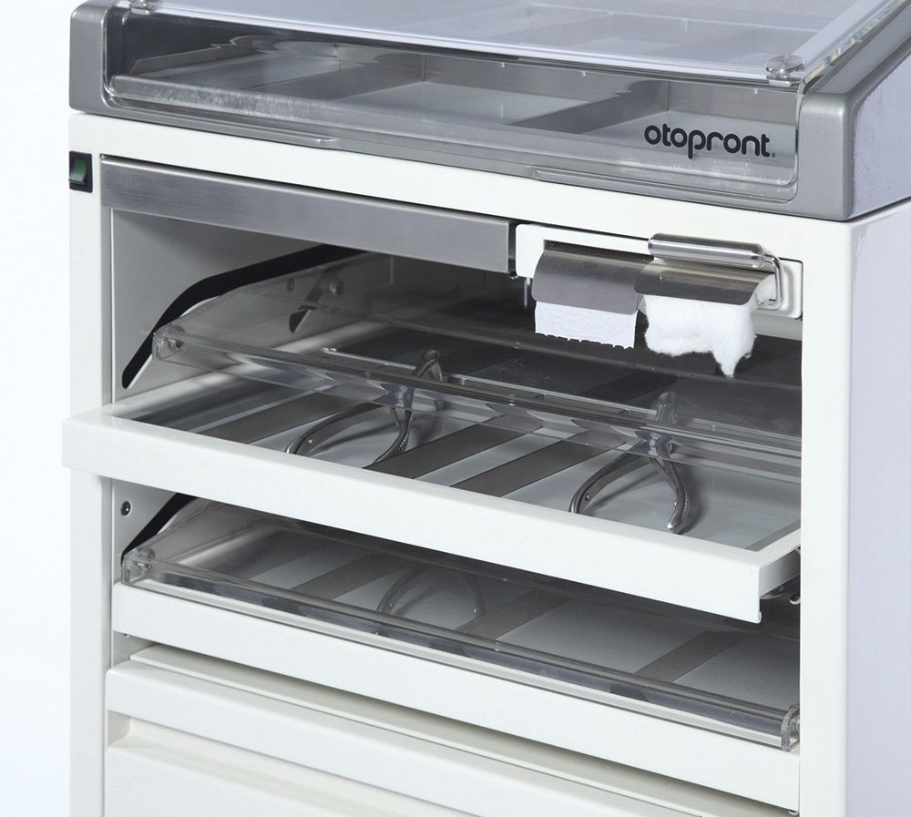 Otopront solved the increasing demand of dust-free storage of instruments on the part of the hygiene over several approaches. We offer our QuickSafe system and Soft Close mechanism for the cabinets's instrument trays. Optionally instruments may also be housed in automatically opening drawers with windows.