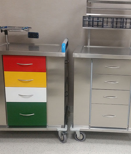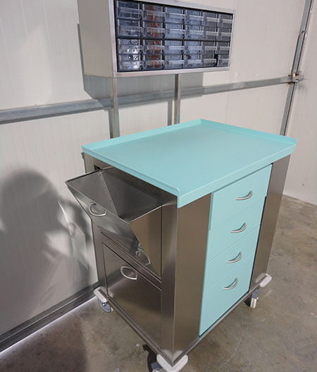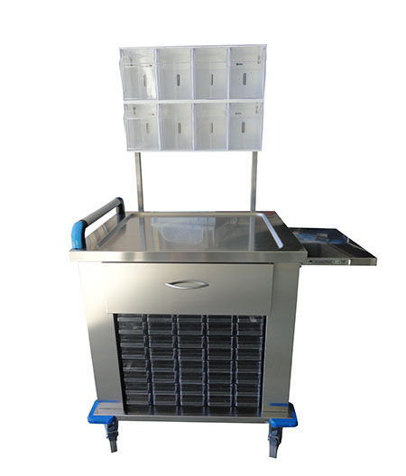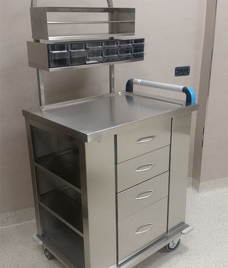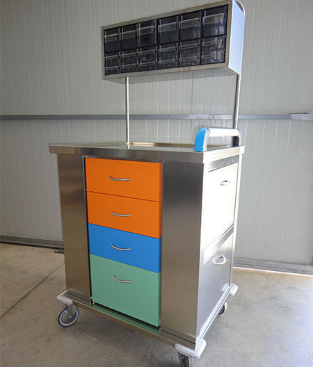 Medical trolley made of AISI 304 stainless steel with Scotch-Brite finish with basin, side-push handle, drawer unit, side shelves, hopper. It can come with a wide range of optional components. Mounted on swivel wheels, 2 of which with brakes.