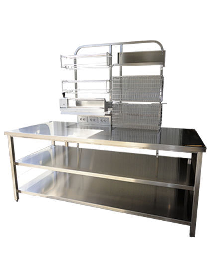 Mounted on adjustable feet. This table is manually or electrically height-adjustable. The accessories include a table lamp, a lamp with magnifying glass, trays, roll-holder with cutter and shelves.