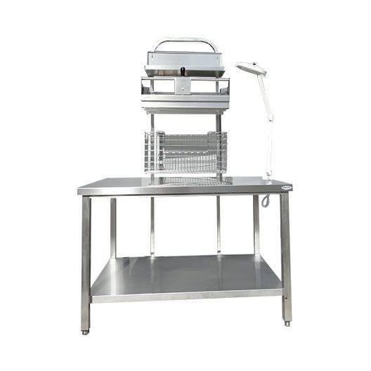 Packaging table made of AISI 304 stainless steel with Scotch-Brite finish, composed of a tubular structure (40 x 40), hollow core smooth tabletop, lower shelf (optional), 1, 2, or 3 rear accessory compartments.