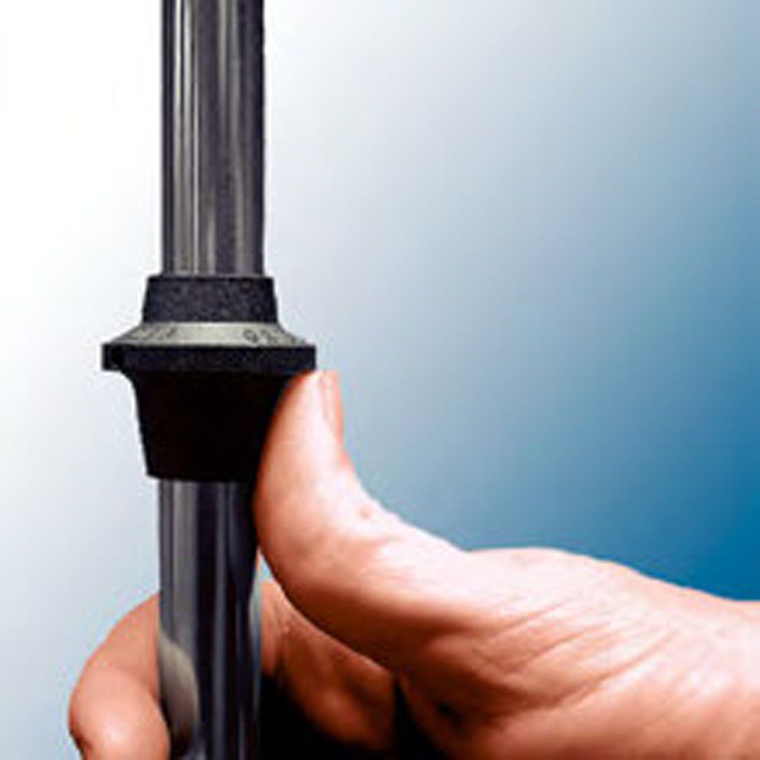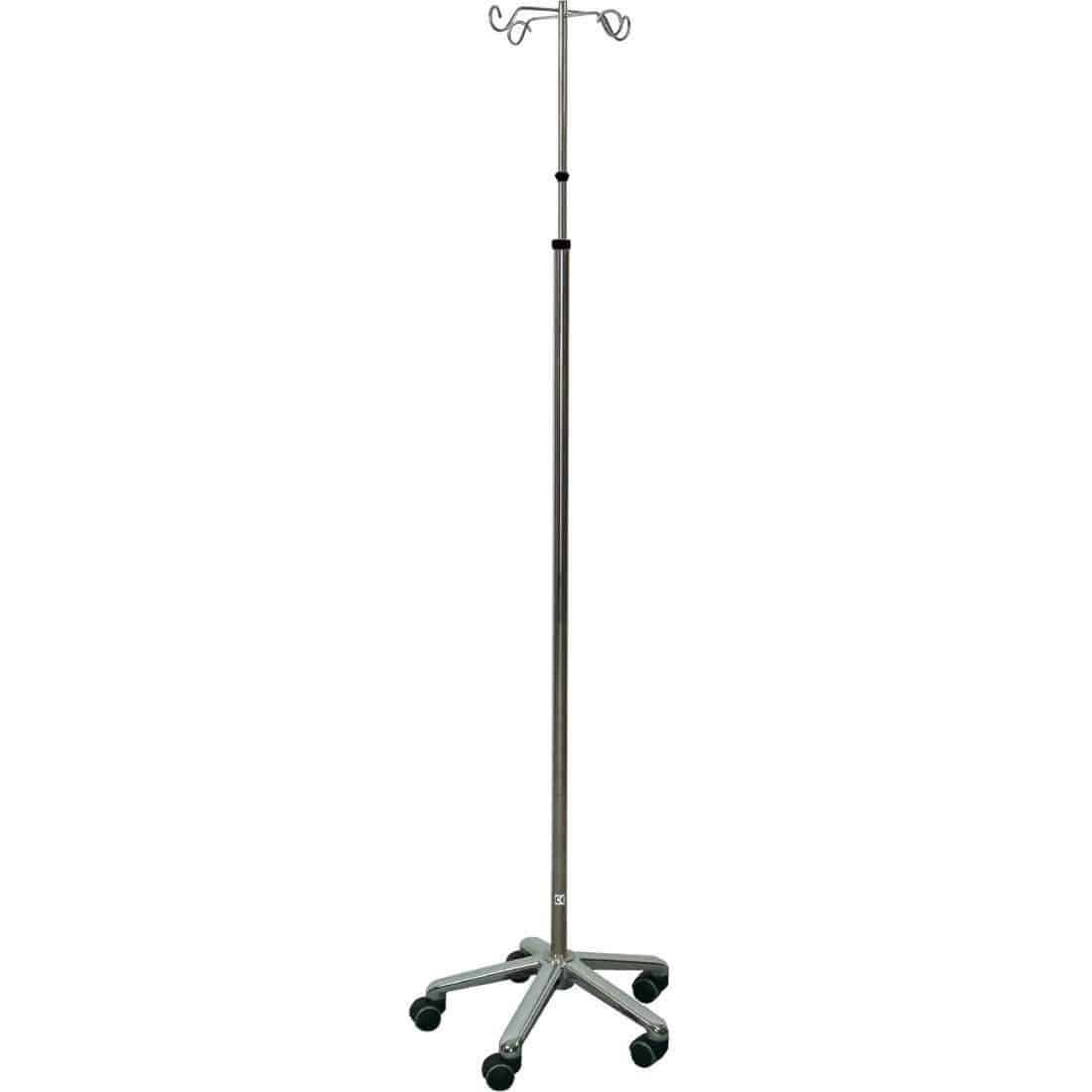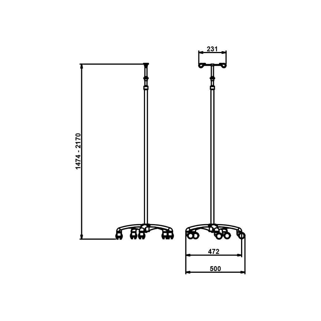 Auto blocking system Sliding unit in stainless steel round tube (irremovable pole) Tube ø 25 mm allows fixing of accessories Twin nylon castors ø 50 mm Stainless steel ramhorn hooks Until 5kg hooks capacity Brilliant polish finish aluminium 5-branch base ø 490 mm Adjustable height from 147 cm to 217 cm