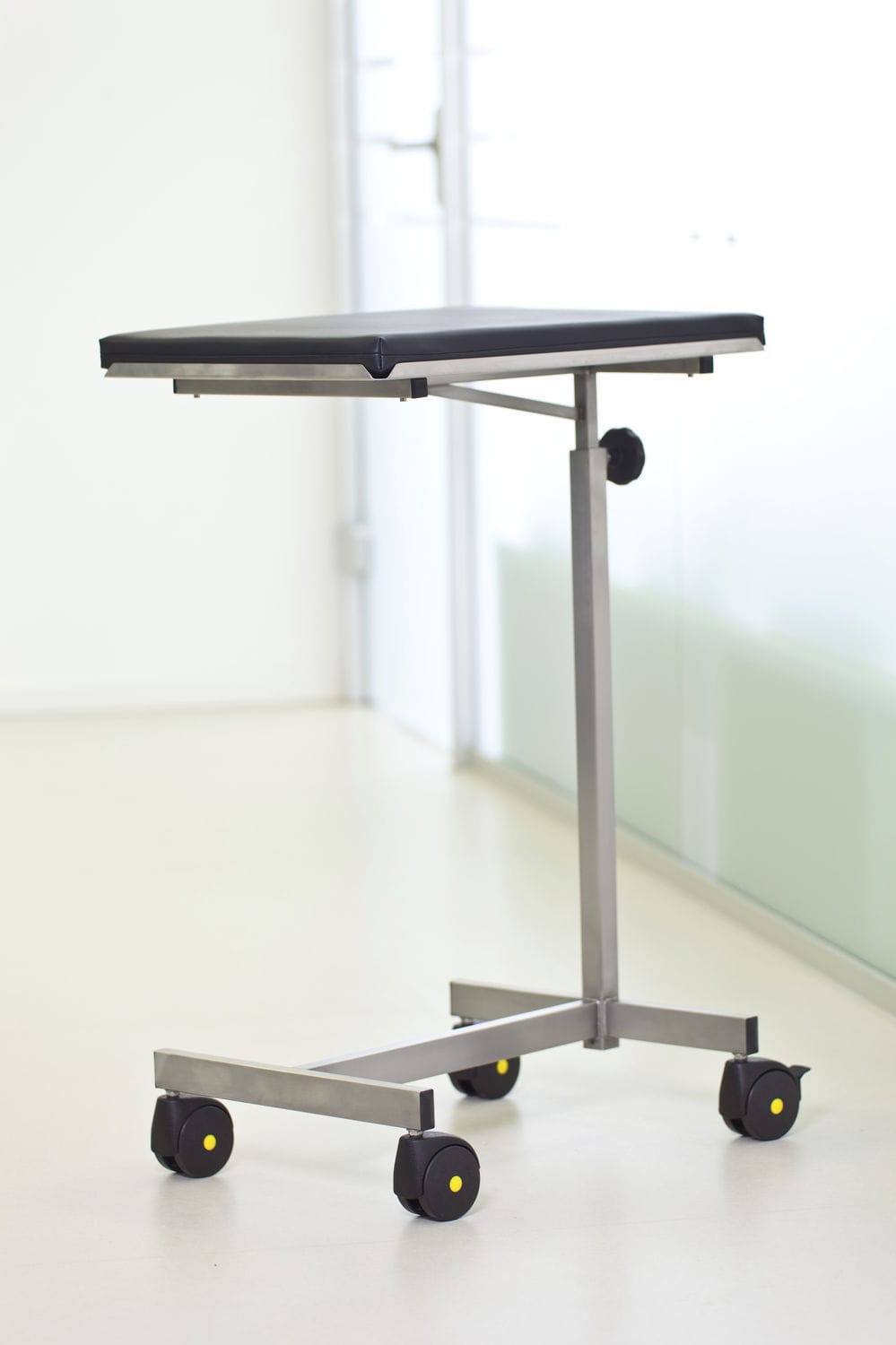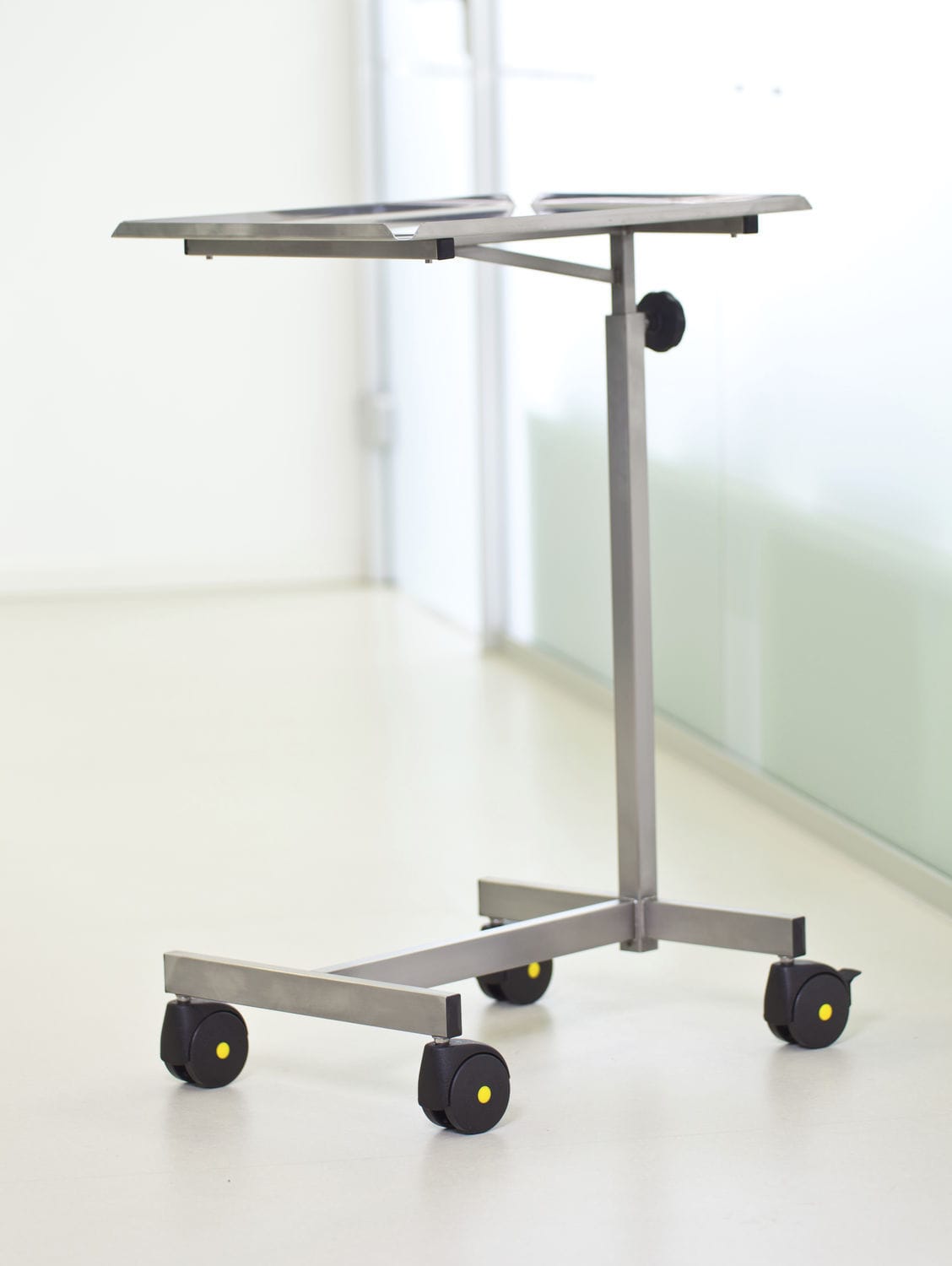 The instrument table, Article No.: ZT-3060/4, can be loaded with up to 15 kg. The base has the shape of an \"H\", consists of a longitudinal and two cross braces and is equipped with four electrically conductive double castors, two with brakes.