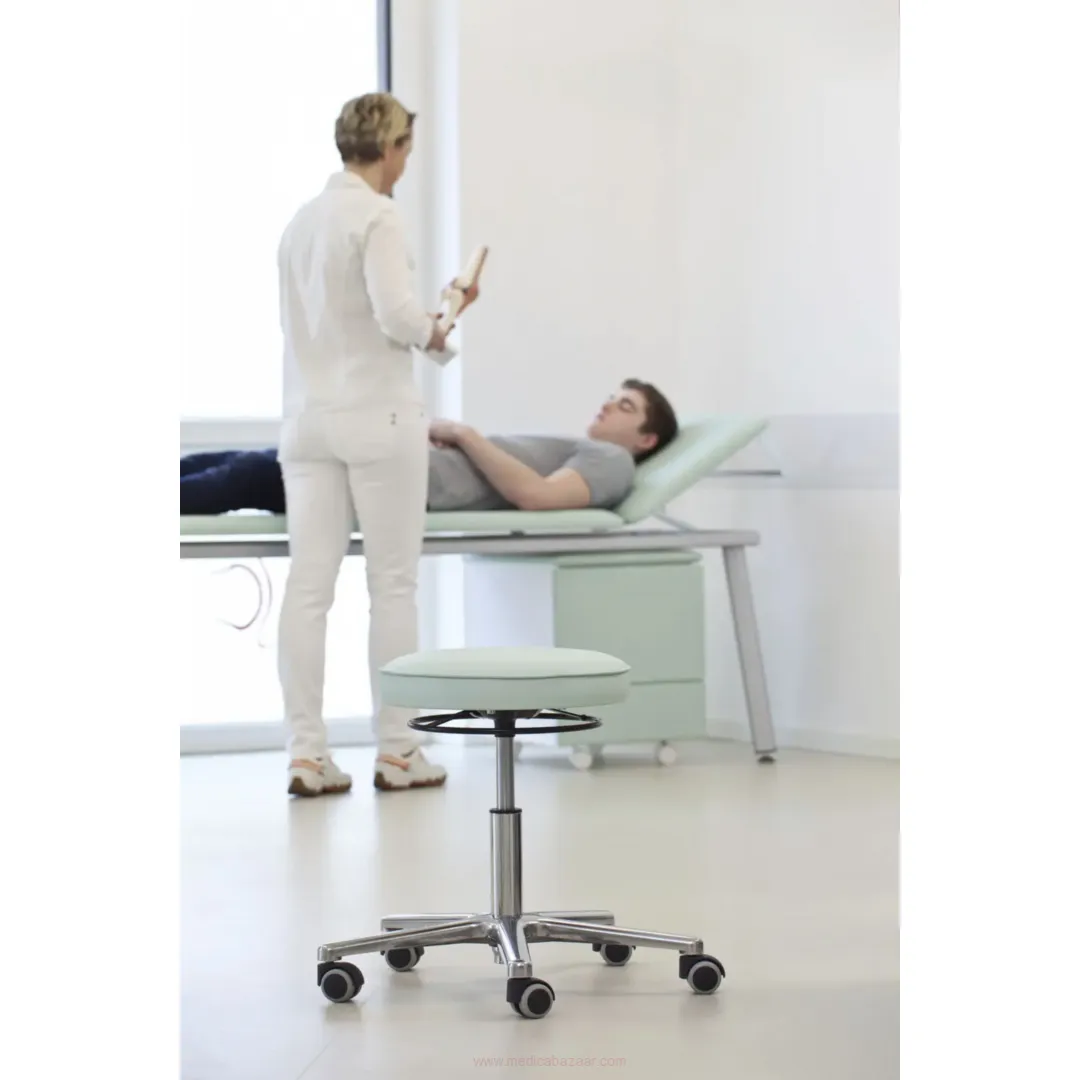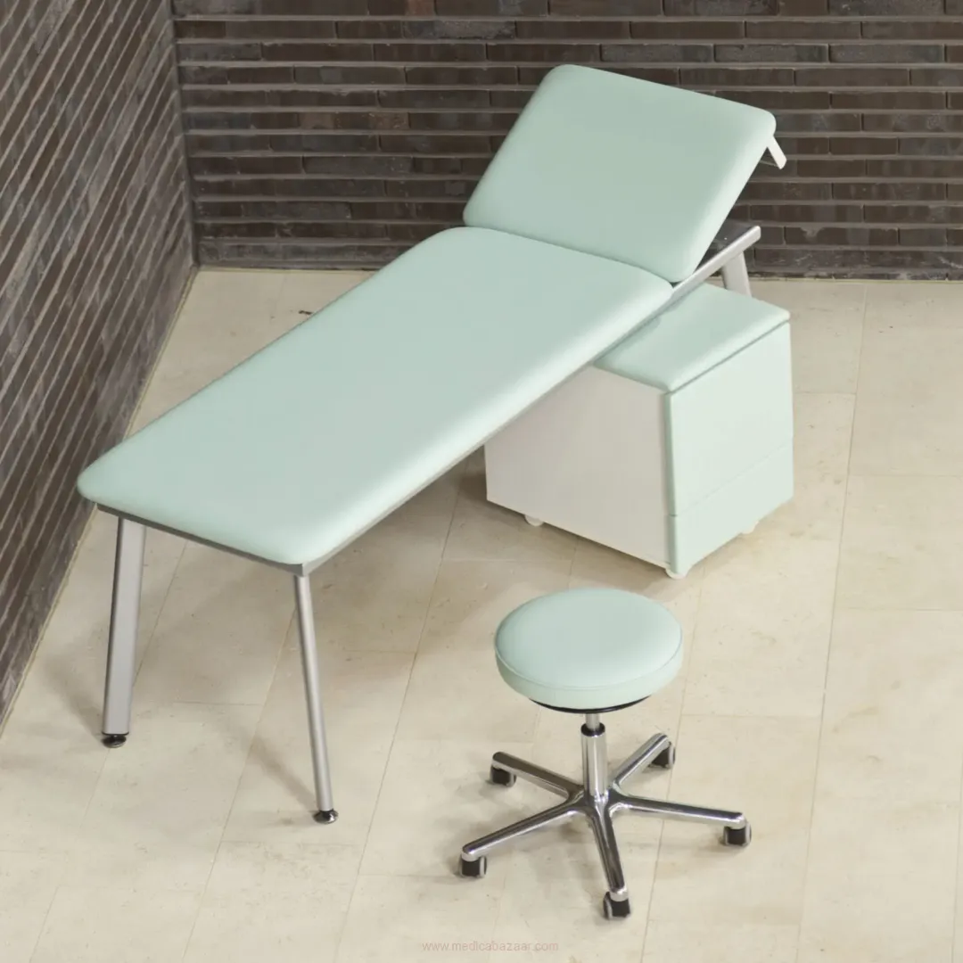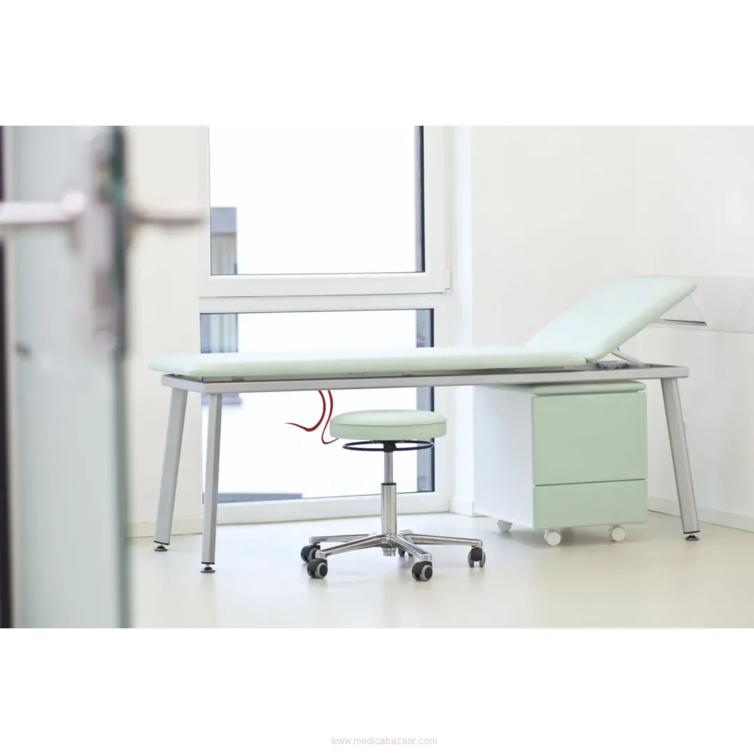 The RUL-6000 treatment table stands out with its shapely design. The upholstered tabletop covered with synthetic leather and finished with softly rounded corners provide the necessary hygiene with the greatest possible comfort. Spacers raise the tabletop slightly from the main frame, further enhancing the overall look of the table.