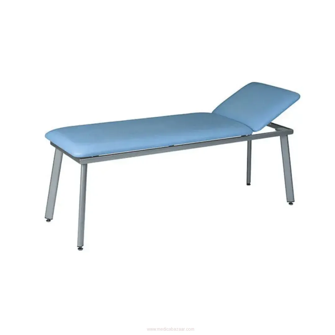 Universal examination/treatment table RUL-6000, flat oval steel tubing frame, plastic-coated, stability through gusset plates in the frame corners, steel tube profile of the upholstery frame 40x20x2 mm, steel tube profile of the bed legs 60x30x2 mm, offset cushions appear to float, two-section tabletop surface, syntheticl leather upholstery, headrest adjustment (+30°) per grid, dimensions approx. 1920x620x700 mm (LxWxH), length of headboard upholstery approx. 500 mm, length of tabletop upholstery approx. 1400 mm, upholstery thickness approx. 47 mm, base frame with leveling feet, max. load 150 kg.