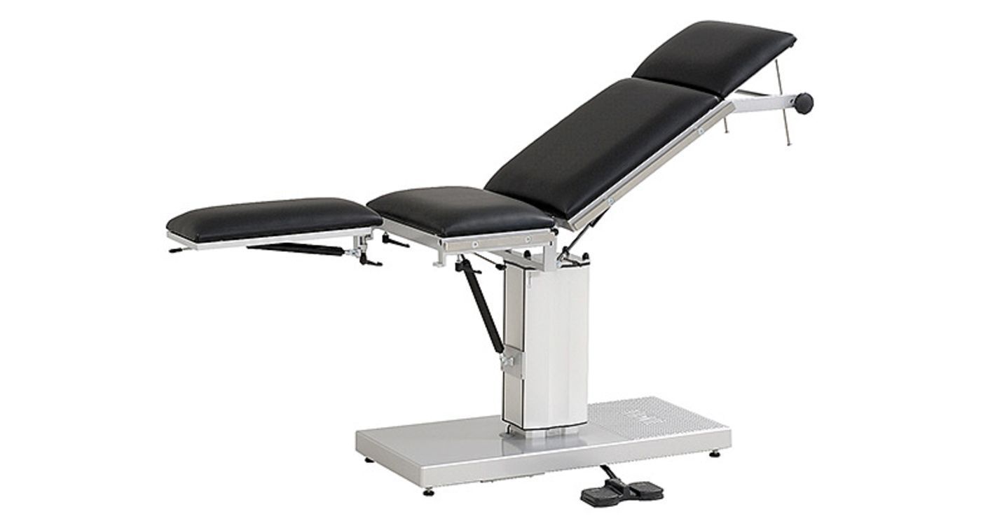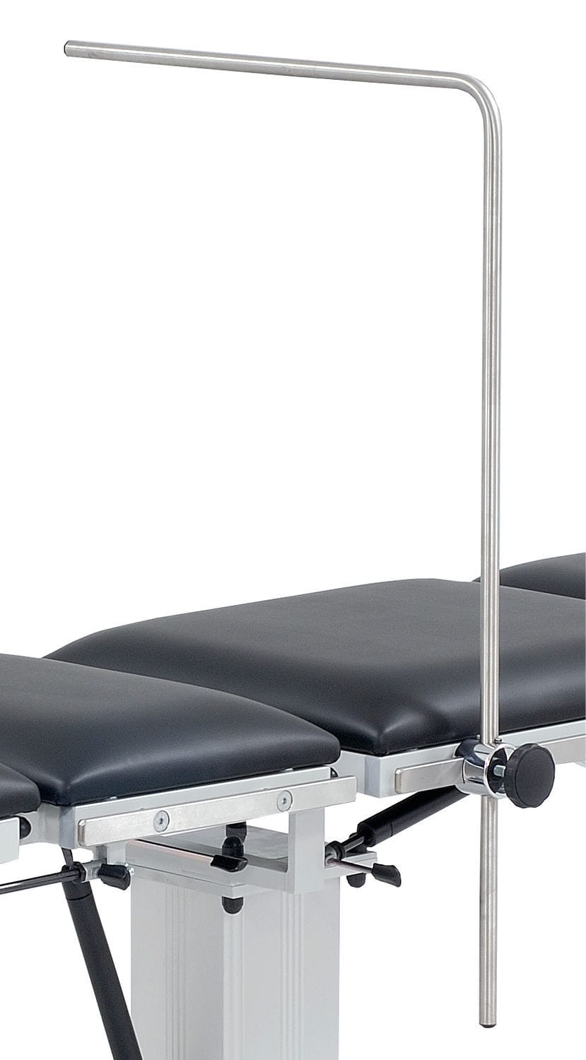 Standard surgical rails (25 x 10 mm) on the outside of the frame of the back, seat and leg sections, for attaching accessory components such as armrests, anesthesia pole, leg holders, etc.