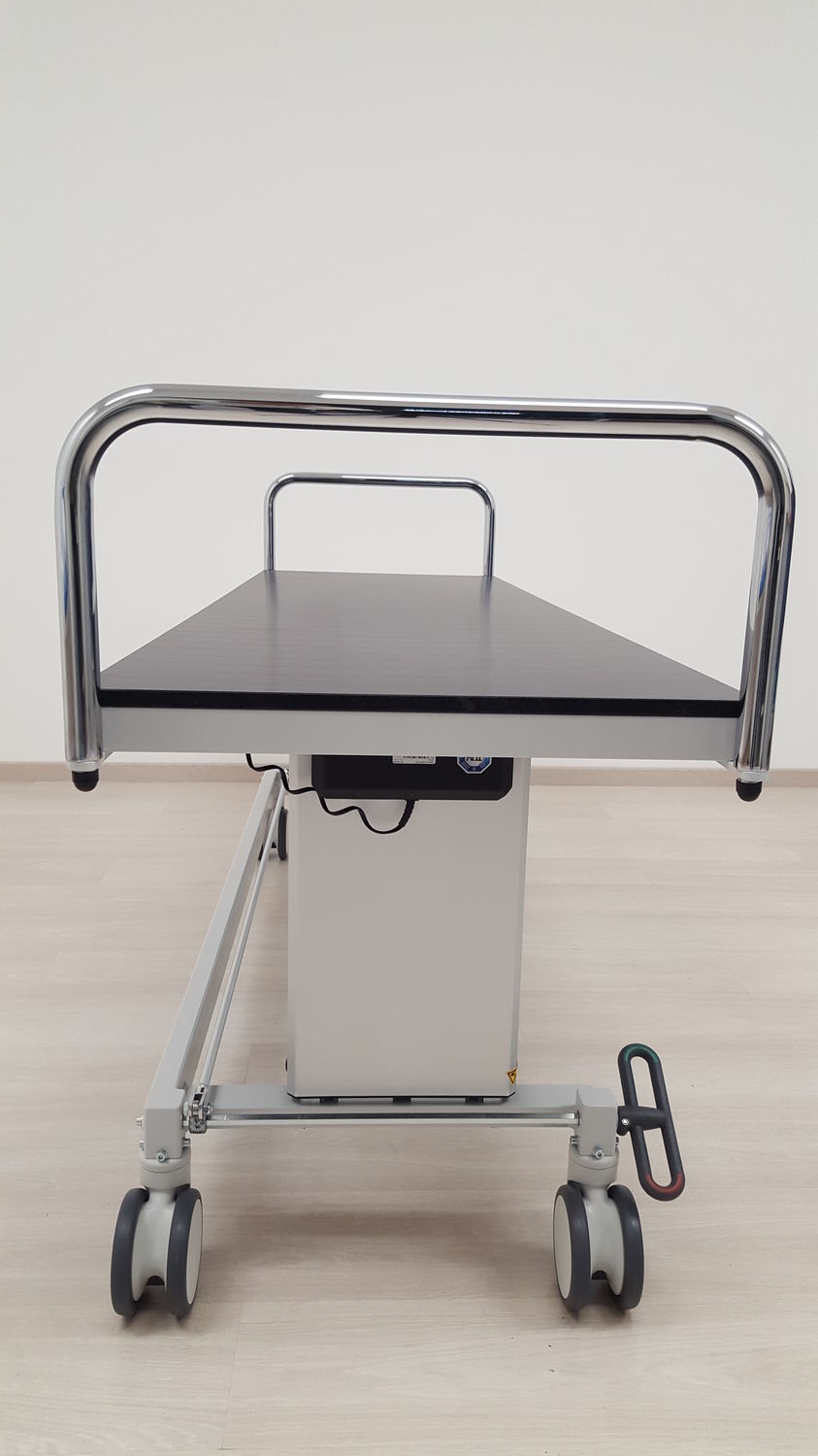 The black, radiolucent support plates (tabletop), made of regenerated PE-1000, have a thickness of 15 mm (for table width 650 mm) and 25 mm (for table width 800 mm).
