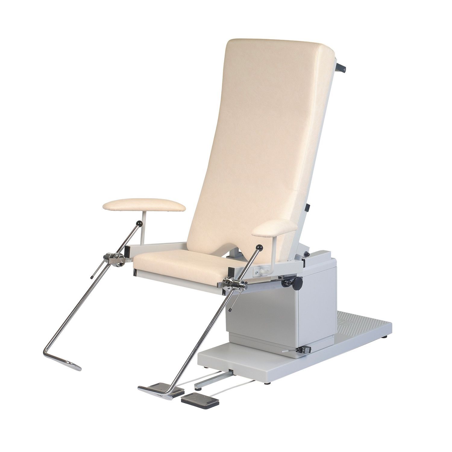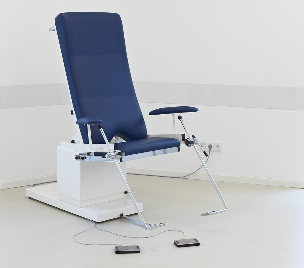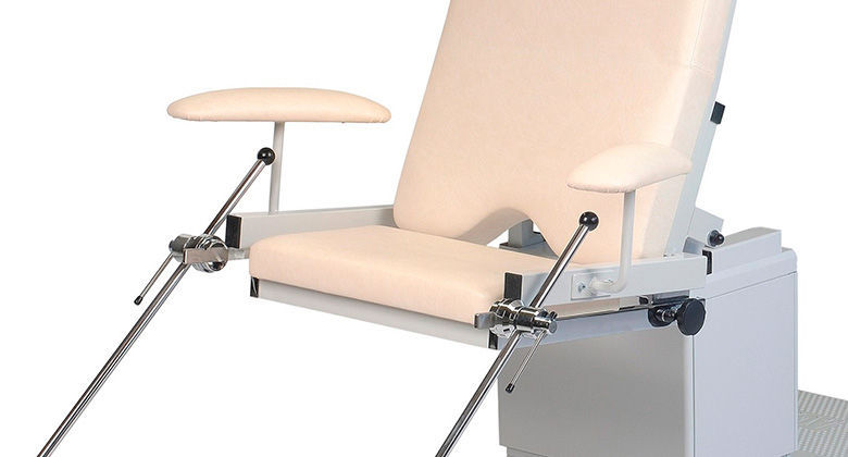 After the attending physician has moved the back section into the horizontal position using an electric motor and positioned it at the best working height for him using the electric height adjustment, the entire seat section can now be unlocked and folded down in two easy steps. The patient is denied visual contact with the examination field. This ensures the greatest possible relaxation and psychological relief for the patient.