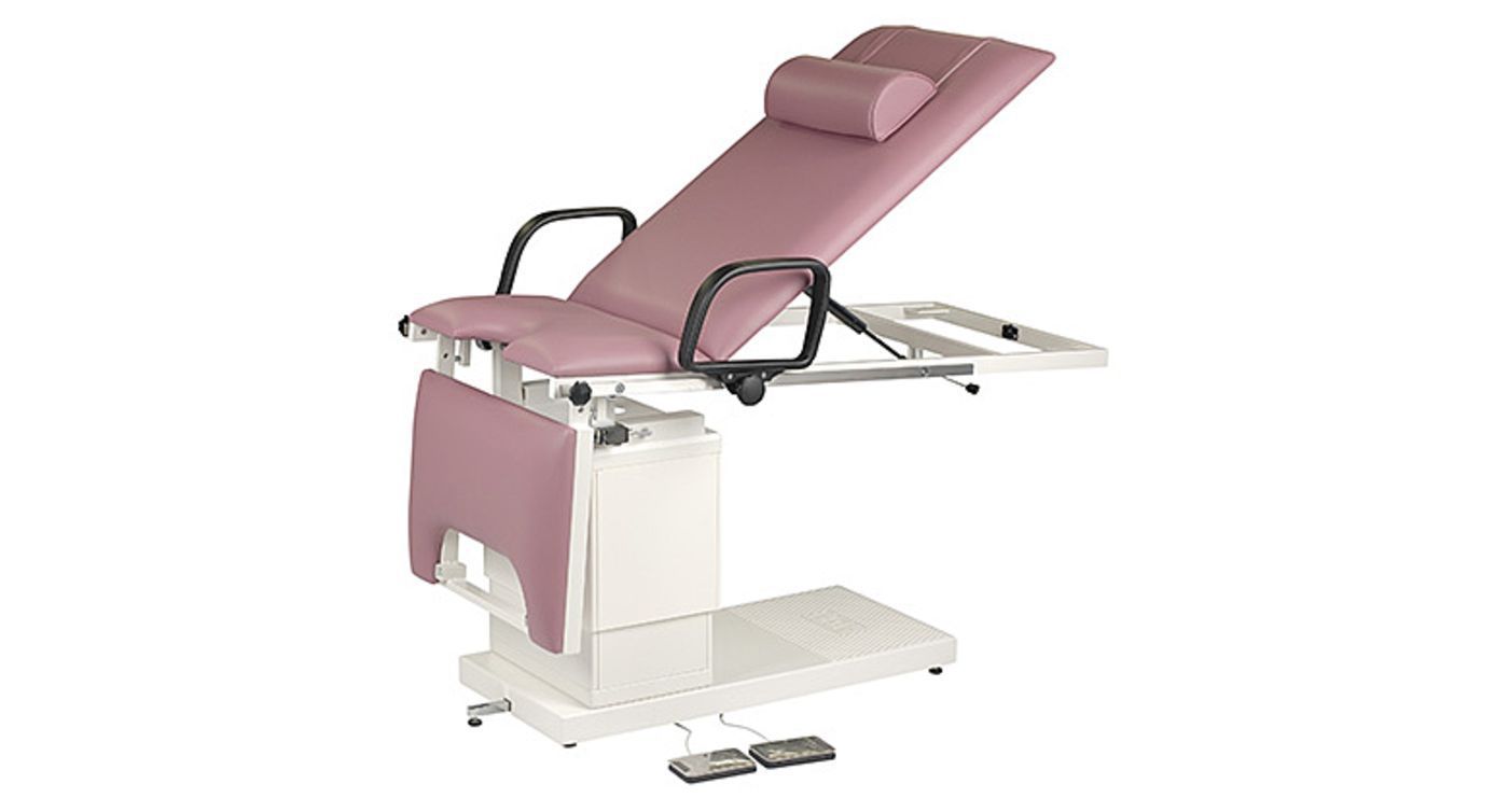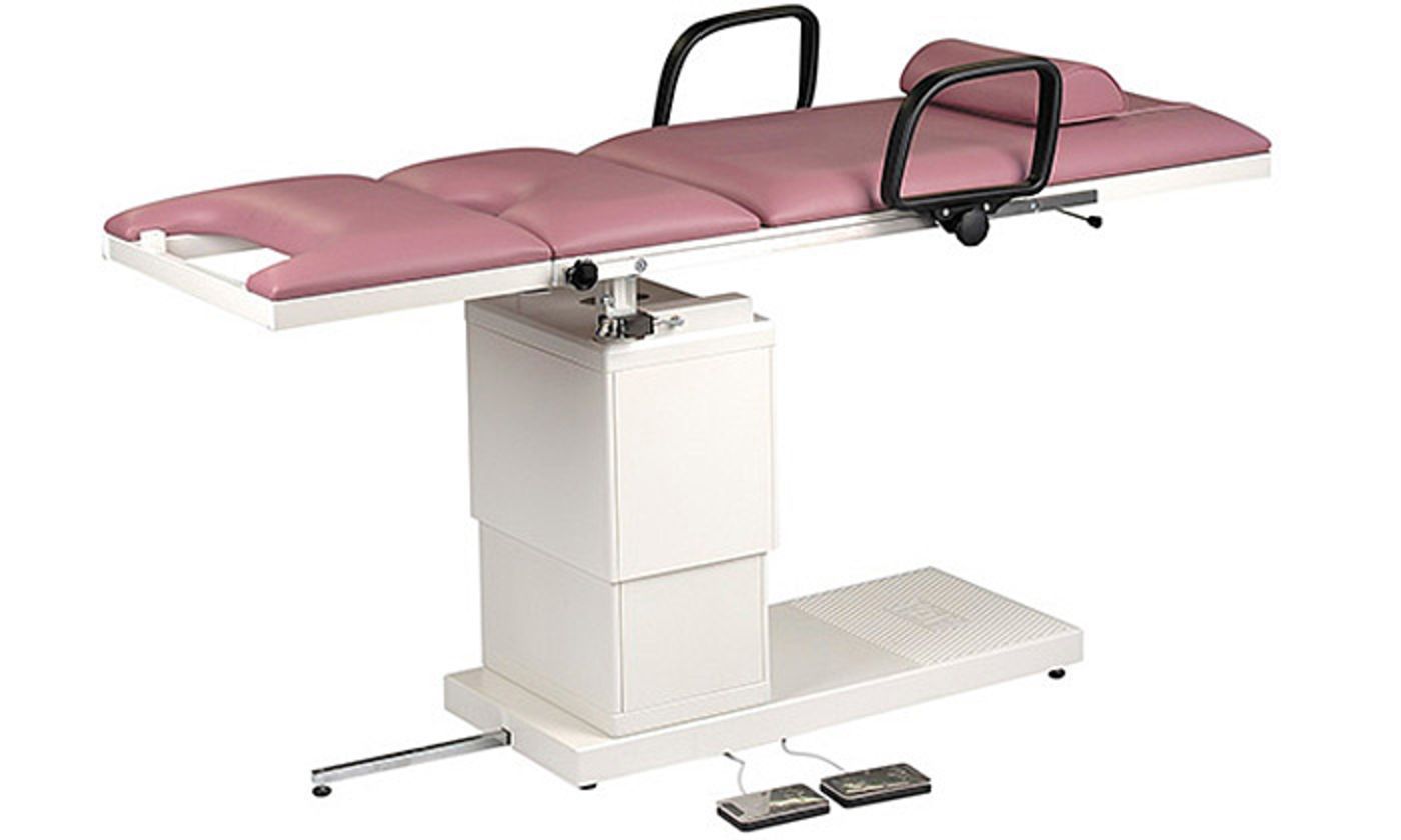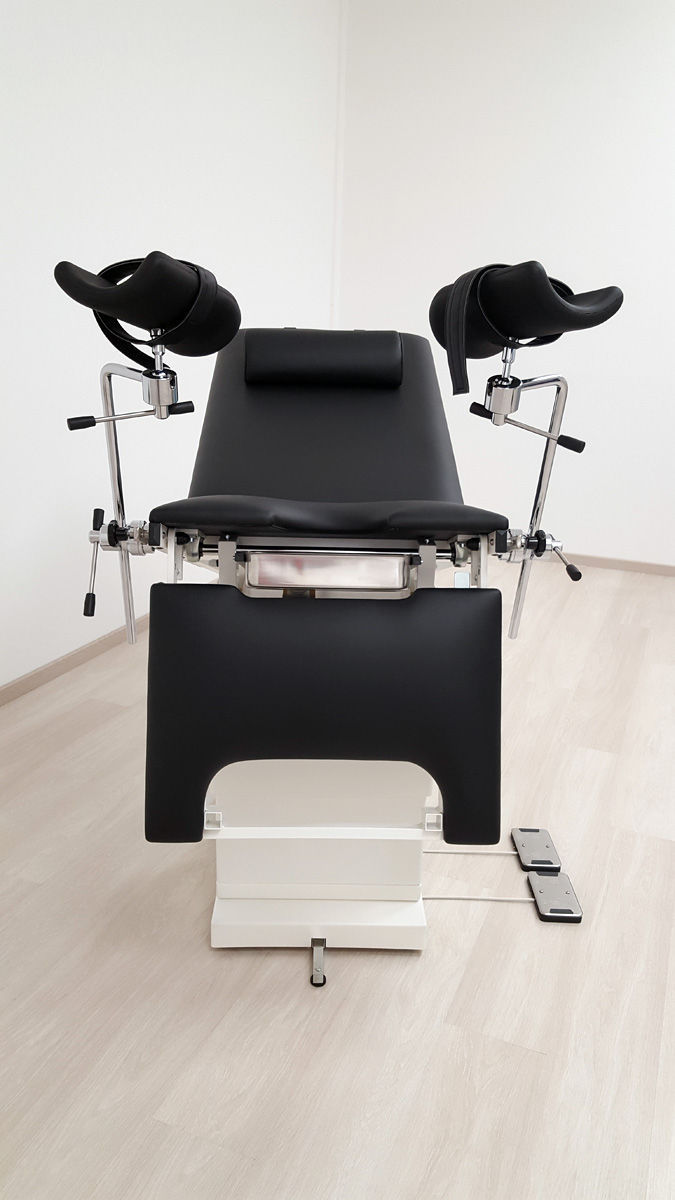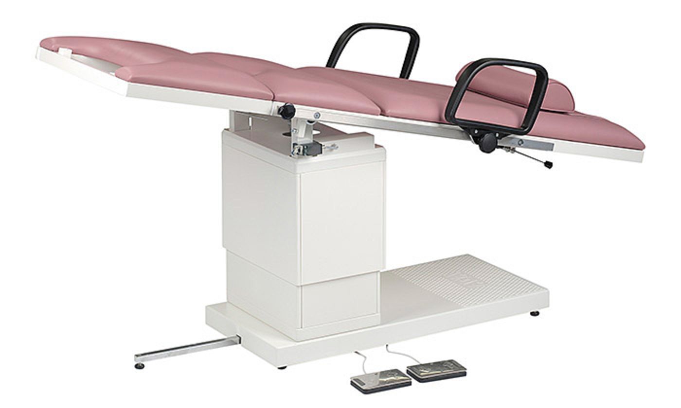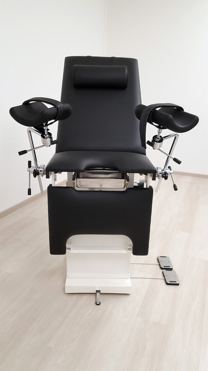 Cutouts are incorporated into the seat and foot sections.The height and tilt adjustments are done with maintenance-free and splash-proof and extremely quiet electric drives, controlled via foot switches (alternatively, at no extra charge, via a hand switch).