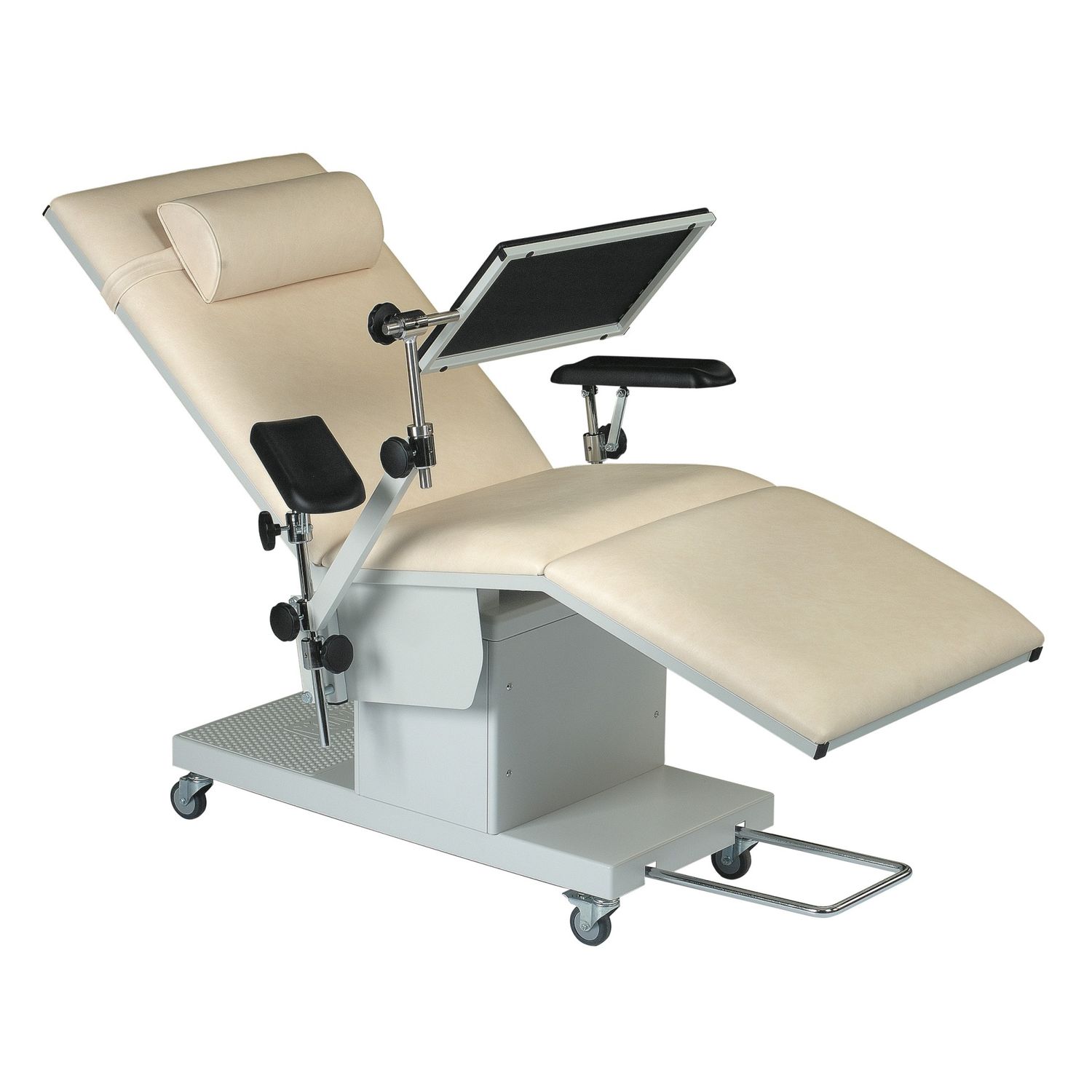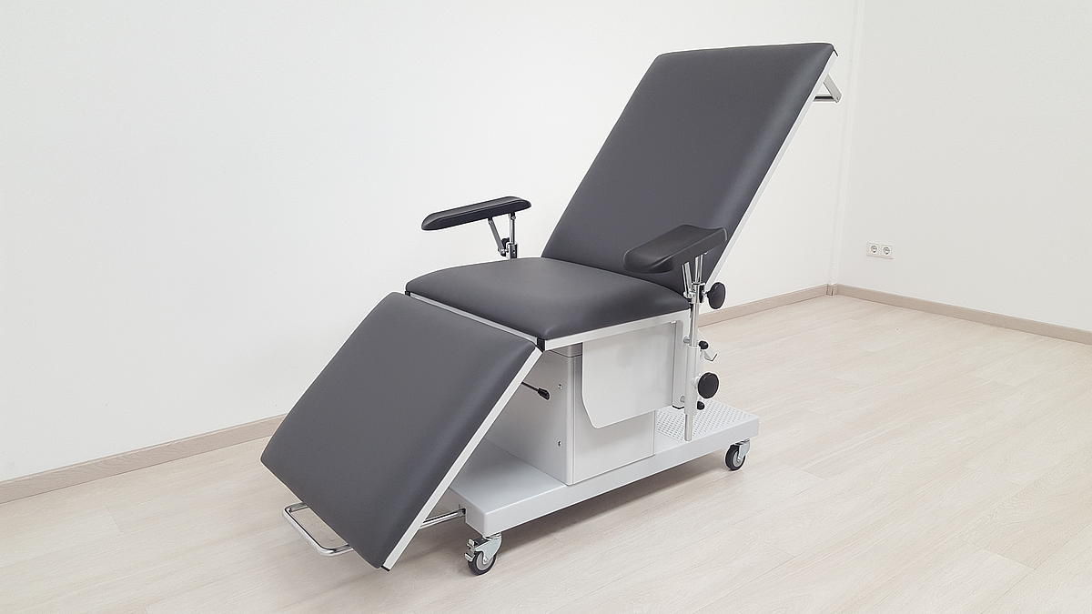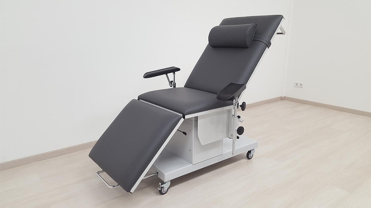 Dialysis is a very time-consuming type of blood purification. It usually lasts several hours. The padding of the dialysis chair is therefore designed to be more comfortable. The electric motor for tilt adjustment can be controlled using the hand switch. During dialysis, the patients can select and change their lying/sitting position using the hand switch, even into the shock position. They do not need to correct their sitting or arm positions, as the two armrests are fixed to the upholstery frame with fastening clamps and, like the blood donation chair above, are moved automatically.