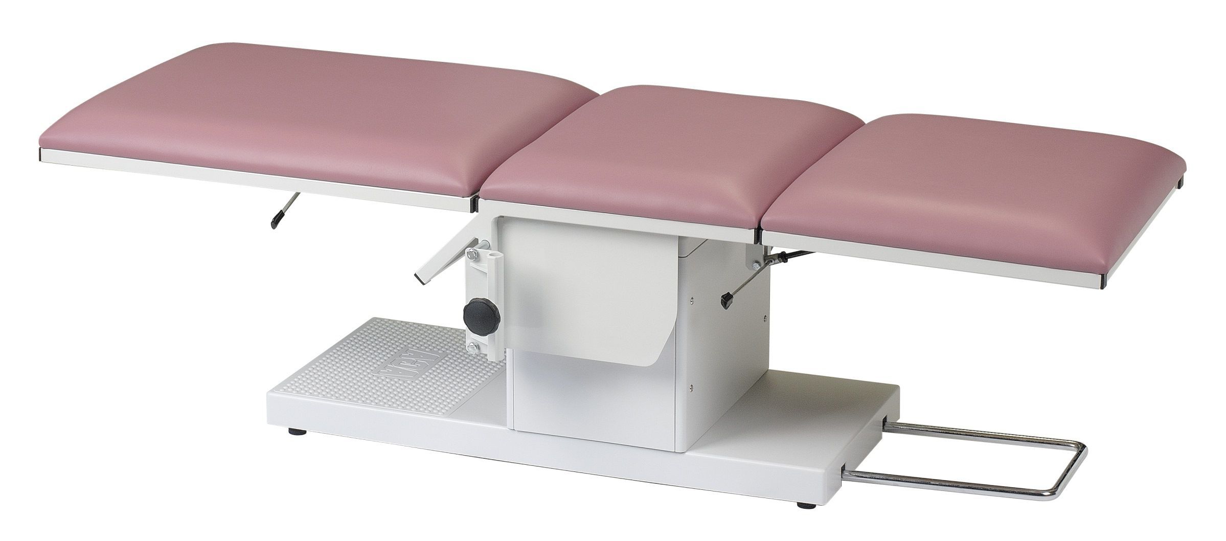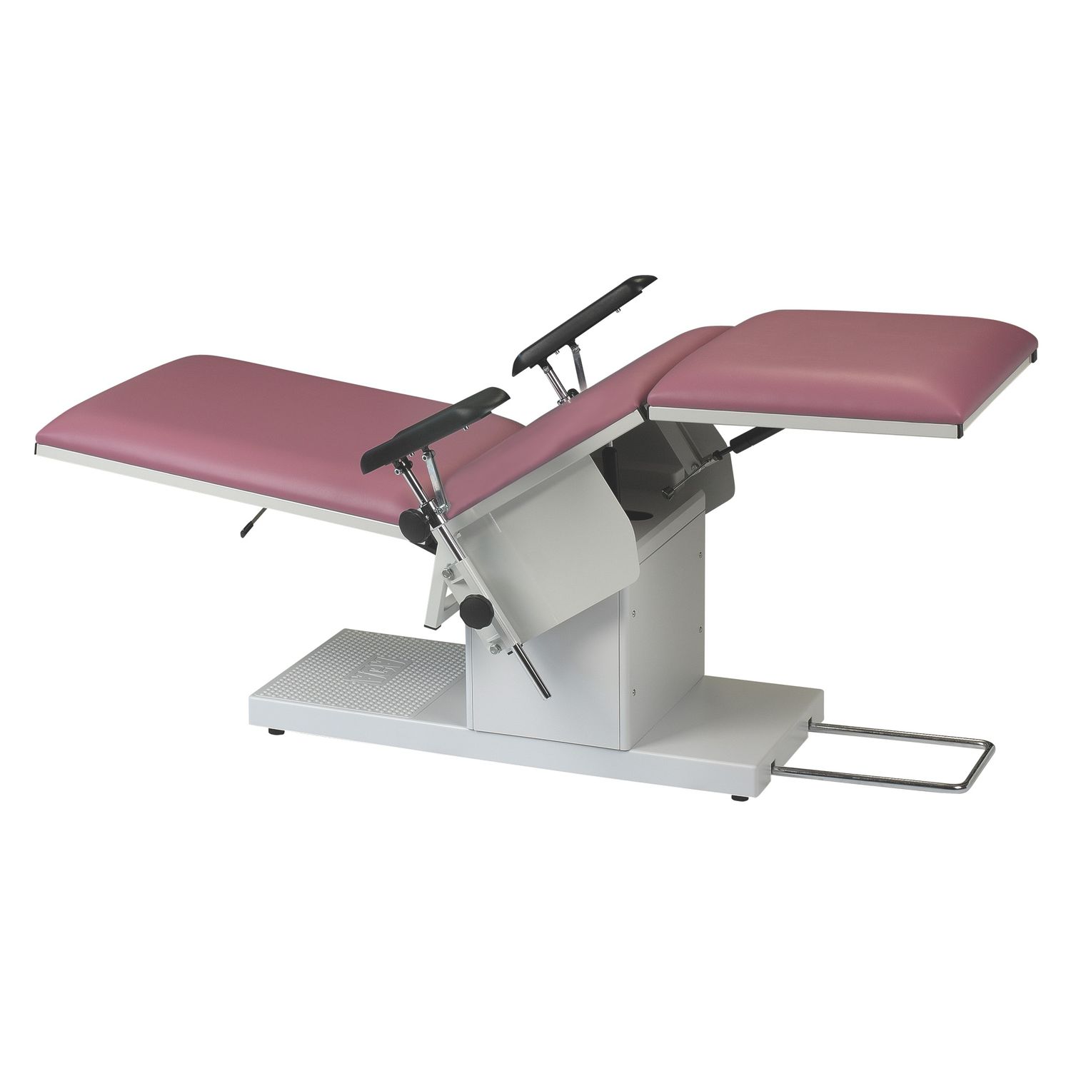 On the blood donation chair from AGA Sanitätsartikel, the adjustment of the entire upholstered frame, including the two armrests fixed with fastening clamps, is carried out using a gas pressure spring triggered via a foot lever located under the leg section on the floor frame and easily accessible from three sides.