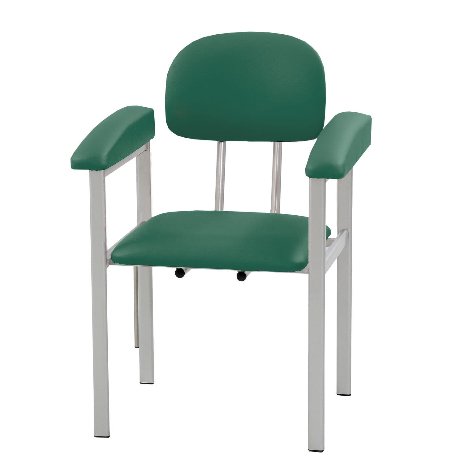 The frames of the blood collection chairs consist largely of flat oval steel tube profiles. The four chair legs are provided with floor protectors (impact caps).