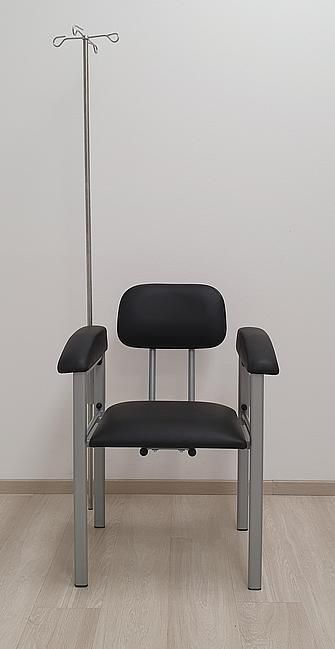 In order to provide patients with a pleasant and comfortable sitting experience during blood collection or infusion, the chairs are supplied with an ergonomically shaped back cushion. The armrests, which taper towards the front and are used to align the arm in the required position, and the seat cushion are also covered with synthetic leather that is resistant to cleaning agents and disinfectants.