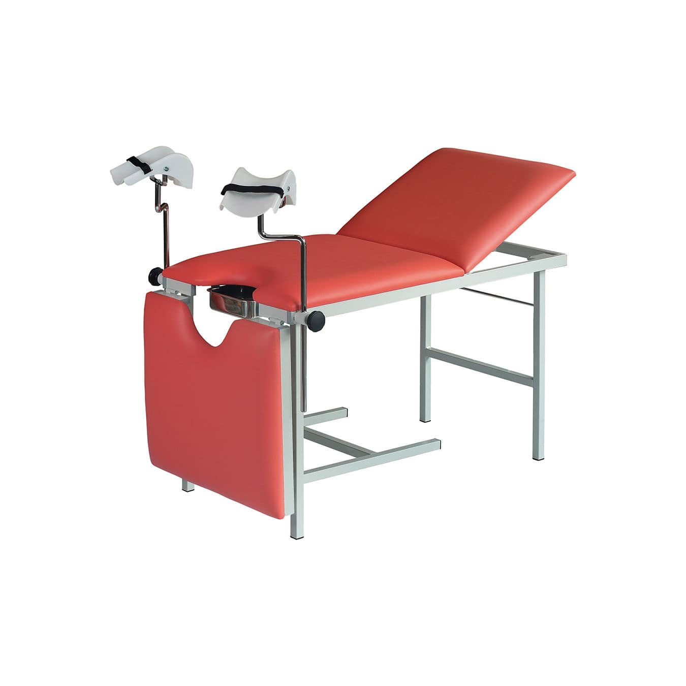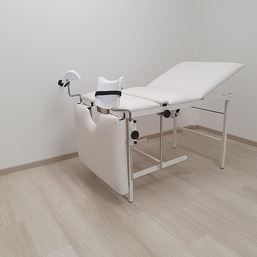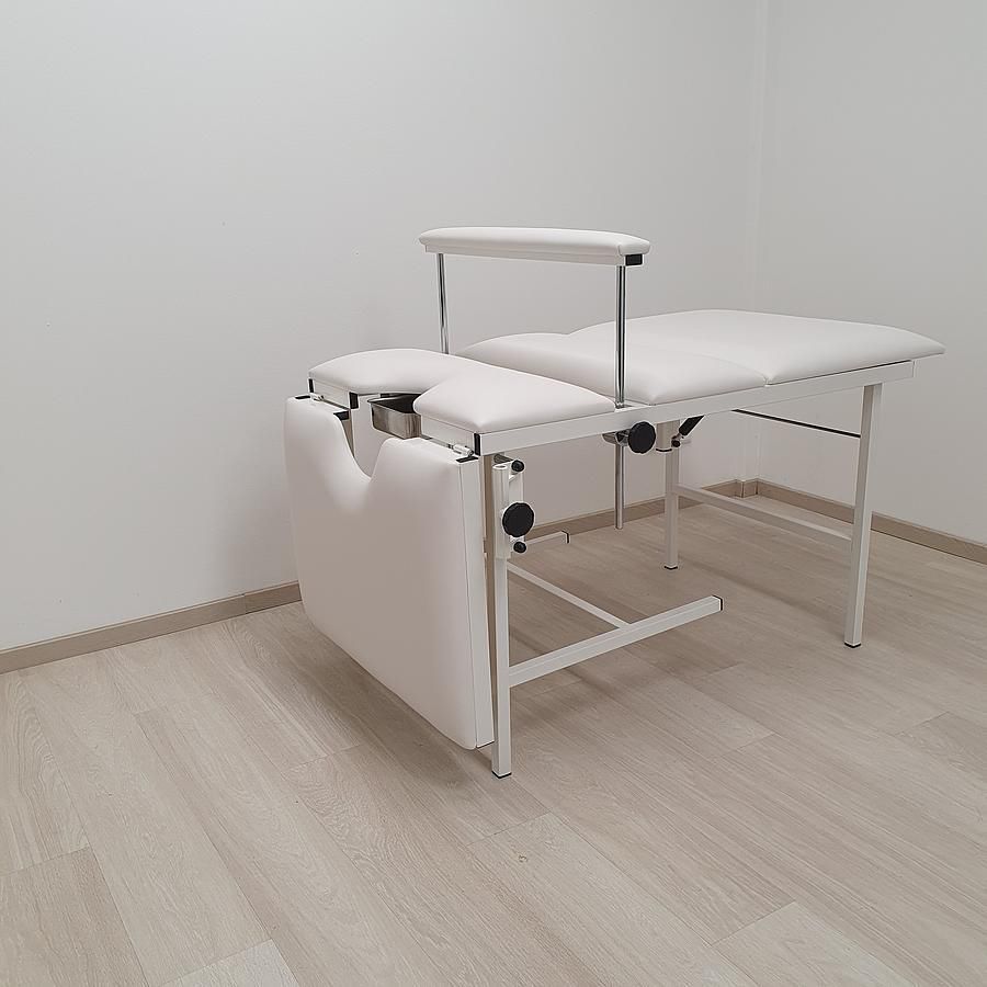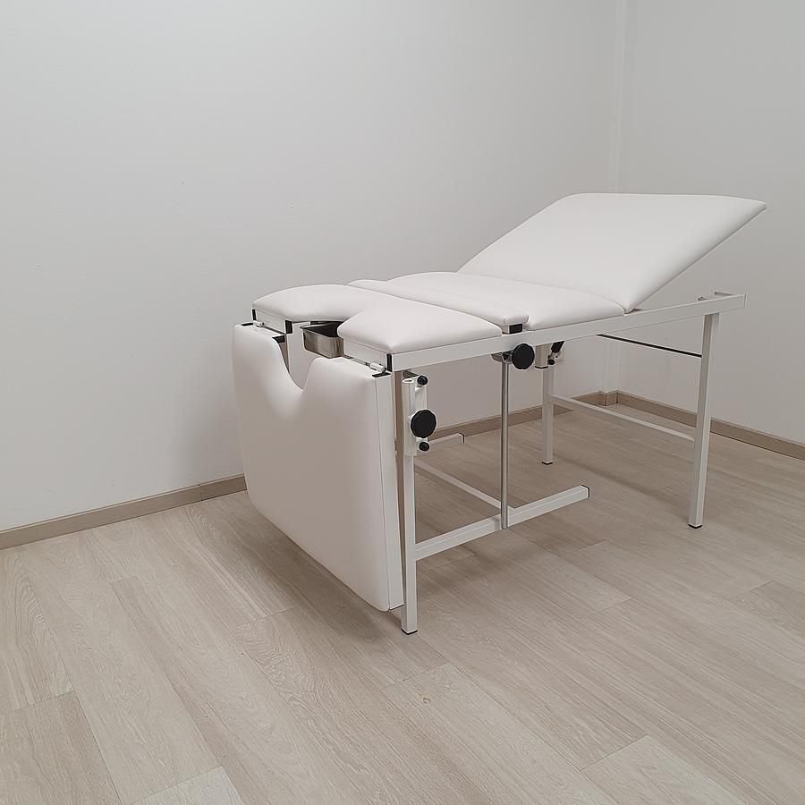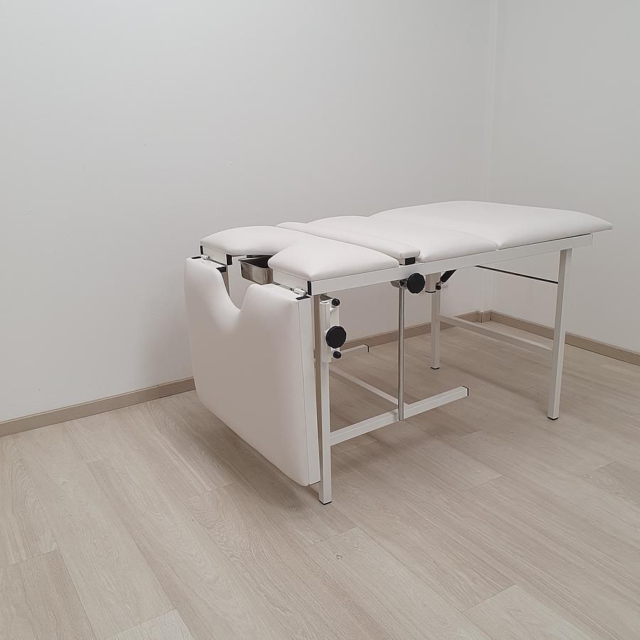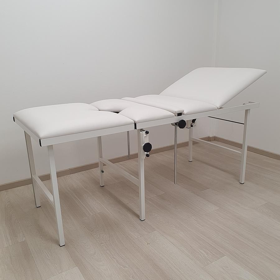 The multi-function examination table, Article No.: MULTIFLEX II, has cutouts in the middle and footrest upholstery.