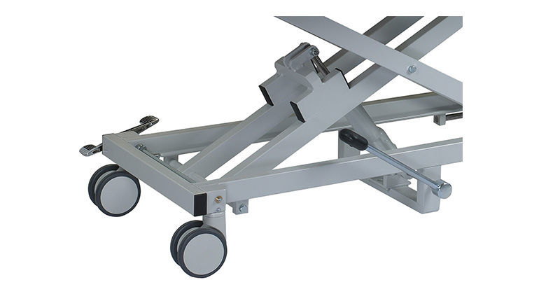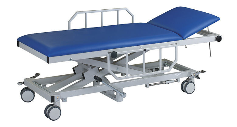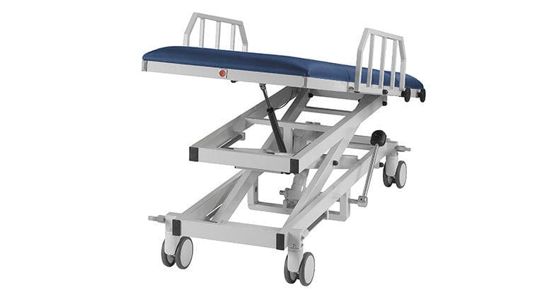 The hydraulic height-adjustable patient transport tables can be used anywhere and at any time due to the power-independent hydraulics and mobility. The adjustable side guards serve as fall protection and allow patients to get on and off from both sides of the table. This guarantees safe patient transport.