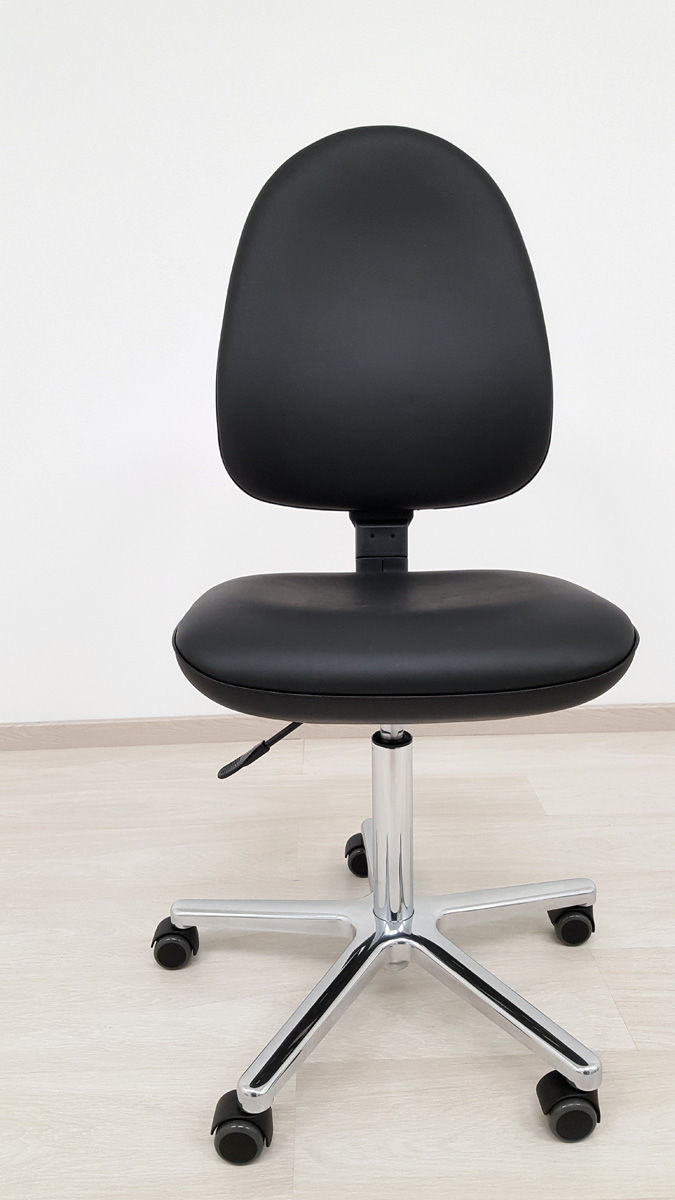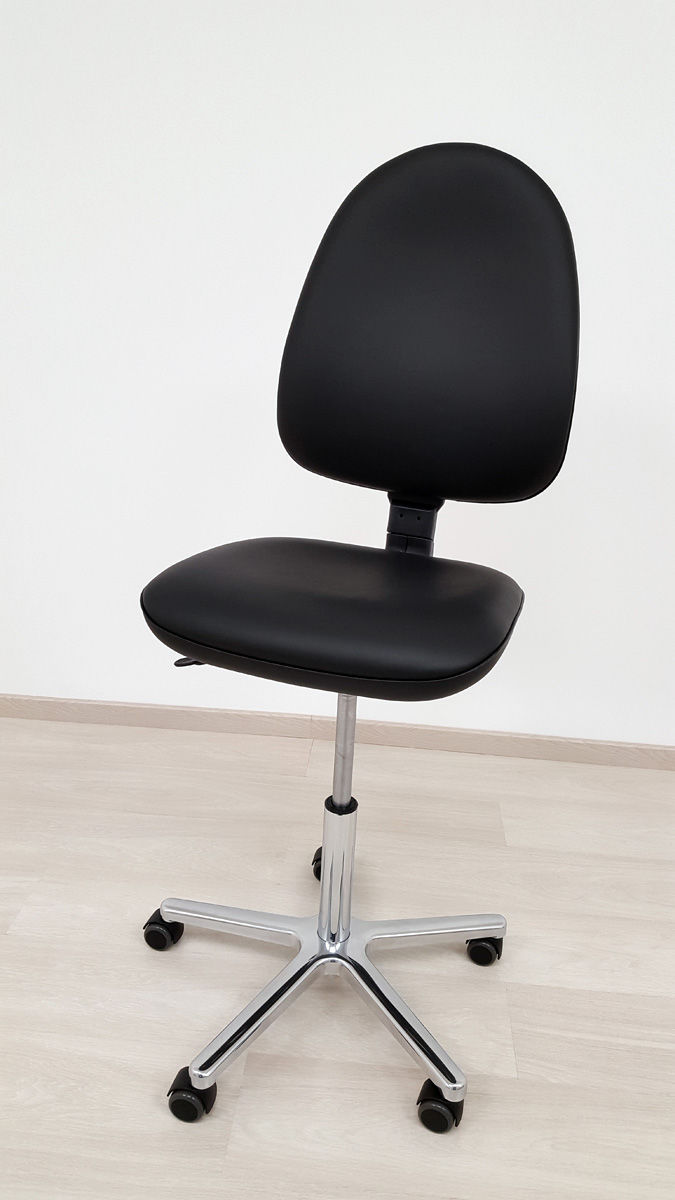 The seat height adjustment is activated using a hand lever located directly under the seat cushion (right side). The chrome-plated gas pressure spring connects the seat cushion and the five-arm aluminium base, which is available in polished and black versions. Five braked double castors are inserted into the aluminium base. The doctor's chairs are available with and without armrests.
