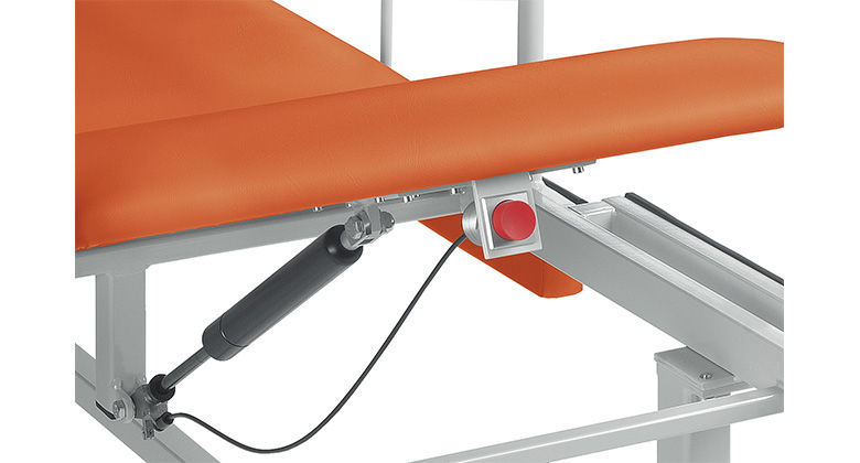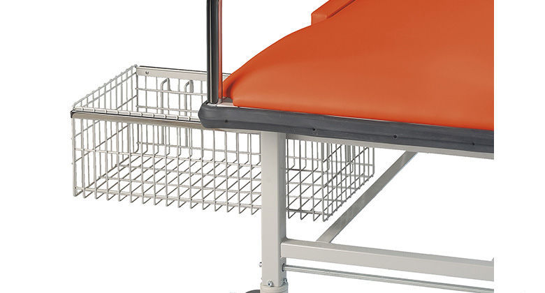 For safer patient transport, the table comes with two side guards, dimensions approx. 760 x 230 mm (L x H), which can be lowered to upholstery height using a pivot mechanism and fixed using sliding bolts.