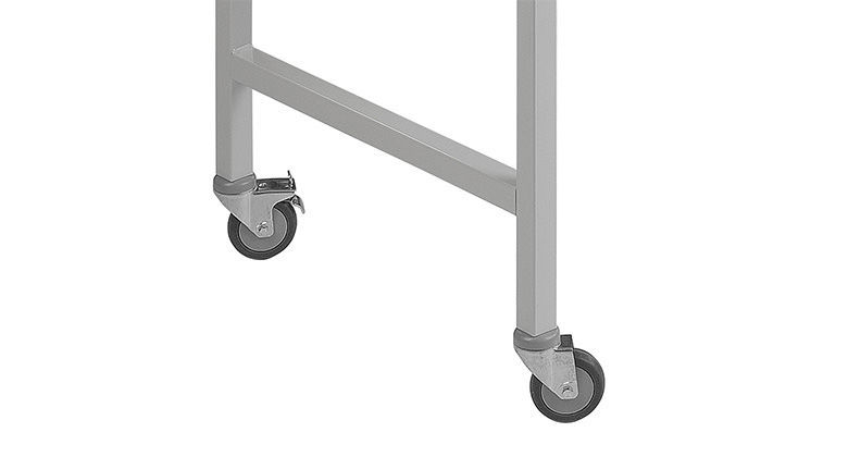 They are equipped with castors, Ø 75 mm. A set consists of four swivel castors, two of which can be completely locked in rotation and running directions.