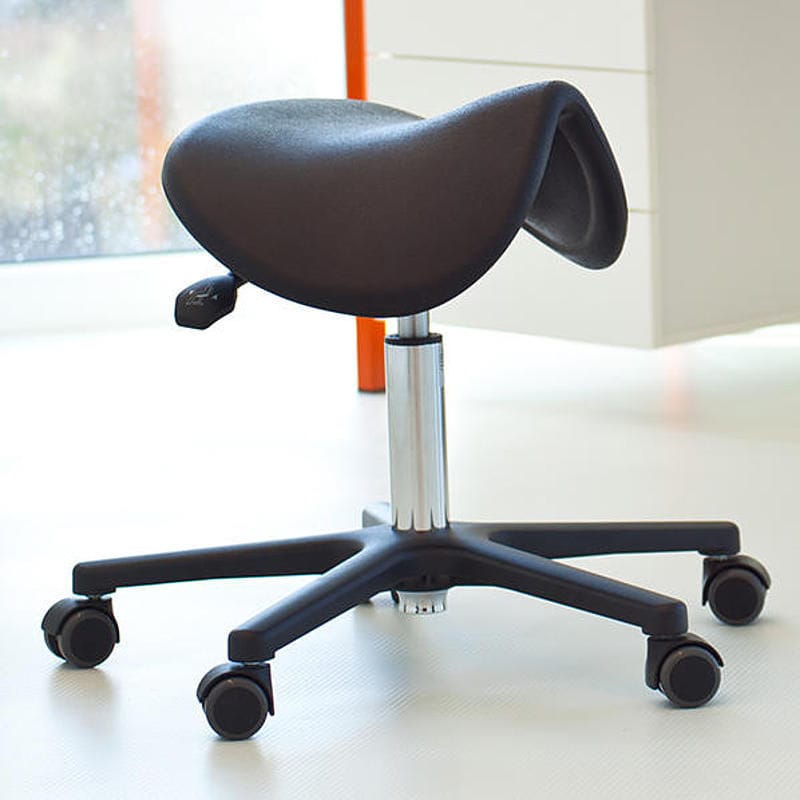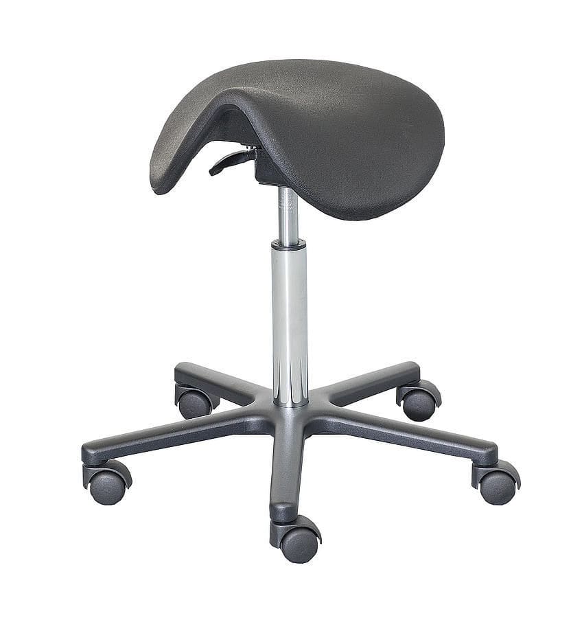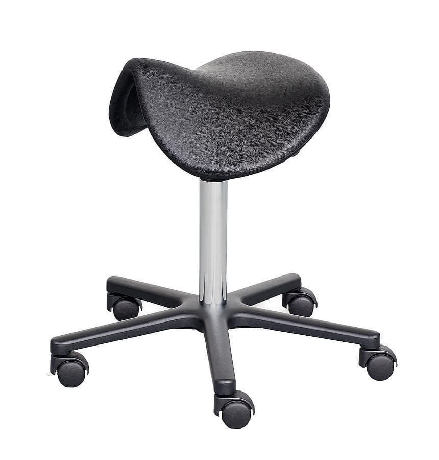 Examination stools have the advantage over swivel stools in that they have a black, PU-foam, ergonomically shaped, adjustable saddle seat instead of the 'standard' seat cushion. This optimizes the sitting posture due to the individual adjustment of the pelvic inclination and the associated automatic straightening of the upper body (spine) thus minimizing back tension. The chrome-plated gas pressure spring connects the saddle seat to the five-armed aluminium base, which is available in polished and black versions. Five braked double castors are inserted into the aluminium base.