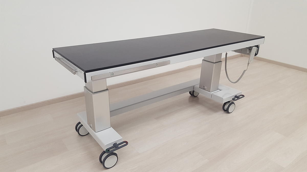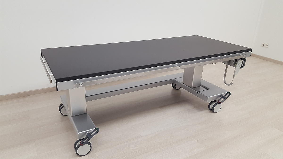 Made of CrNi steel, dimensions approx. 25 x 10 mm, for mounting on the upholstery frame, approx. 13.5 mm away from the upholstery/upper frame with 2 (or 3) spacers. For holding accessory components and lower body radiation protection curtains. Retrofitting is not possible.
