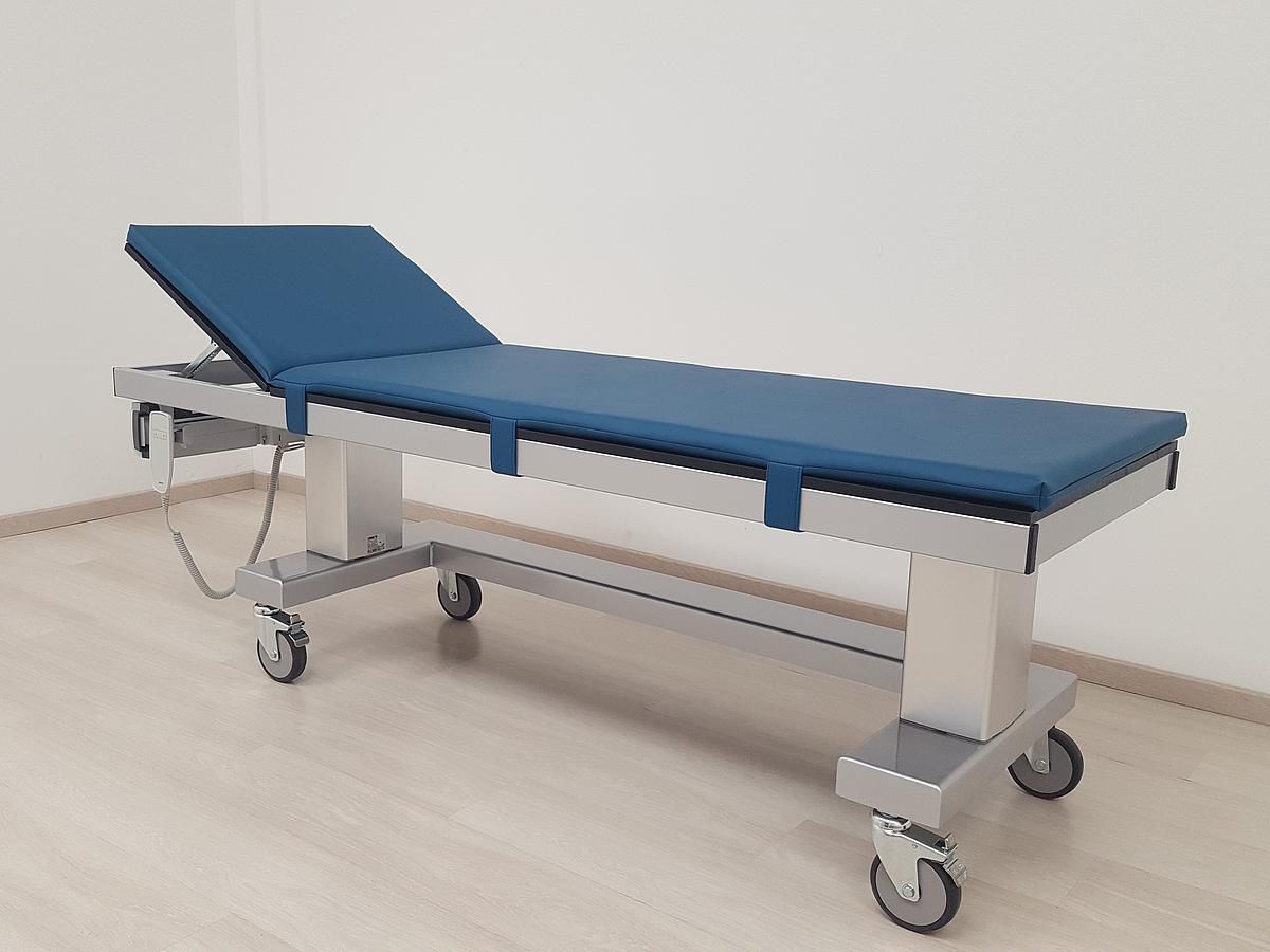 To provide patients with a pleasant and comfortable lying position, upholstered pads (length 1,900 mm, thickness 40 mm) are available in 21 upholstery colours (see upholstery colours) for the X-ray tables. They are fixed underneath the tabletop frame with the help of straps and Velcro fasteners.
