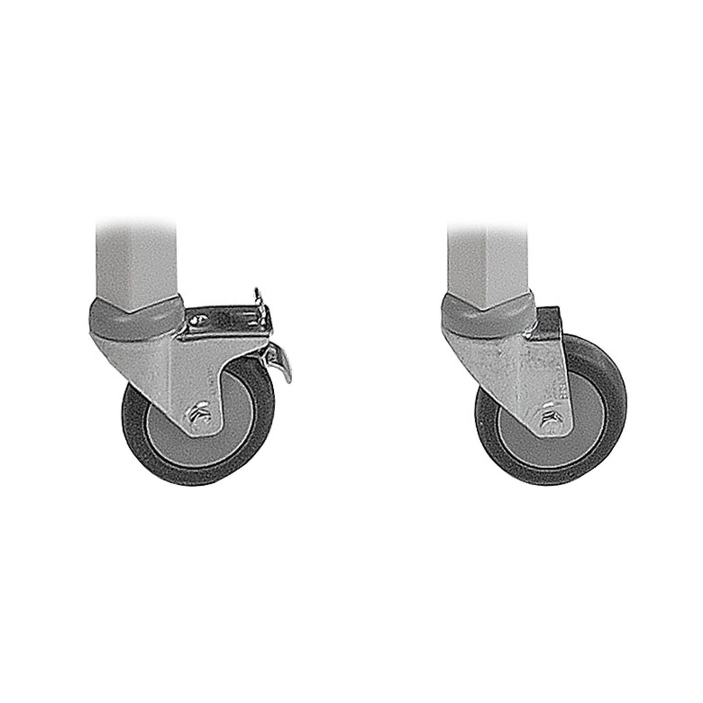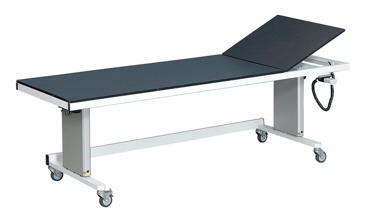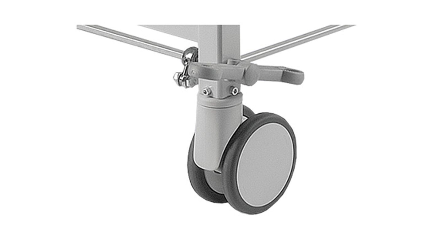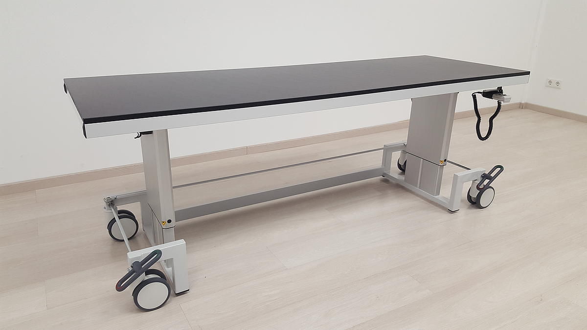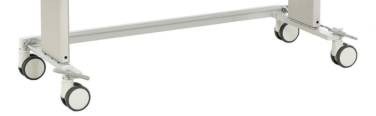 Mobility in the form of a central locking system, all four castors offer excellent rolling properties and are connected to each other by rods, foot pedals are arranged diagonally at the head and foot end, easy to operate and with coloured markings (green = table ready for moving, red = table locked in place). Retrofitting is not possible. Please specify the desired total table height with the castors when placing your order.