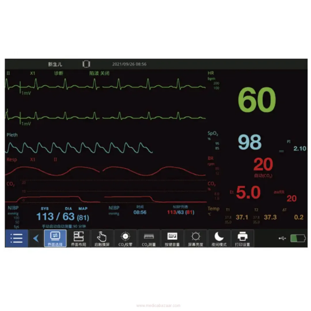 1) Professional ECG algorithm, suitable for monitoring the 3-lead (standard configuration) and 5-lead (optional configuration) ECG waveform and heart rate;