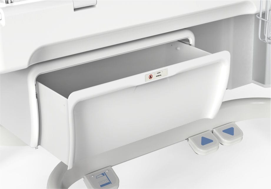The two-way pull-out storage drawer can accommodate a variety of small medical devices.