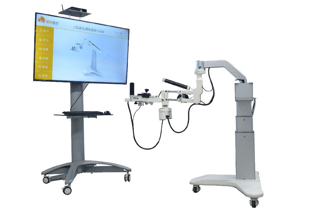 The S500 upper limb rehabilitation training system can realize the active movement ofthe joints of the upper limbs. By adjusting the height of the lifting column and adjustingthe length of each joint, the treatment needs of different patients can be met. Thedevice can accurately collect the angle movement changes and grip strength changes ofthe patient's joints in real time during training, and upload the collected data to the hostsoftware in real time. Through software processing, the changes in the patient's angleand grip strength are used for rehabilitation training in coordination with the game.After the training, the patient's training data will be saved to the computer database,and the therapist can view and evaluate the patient's recovery at any time.