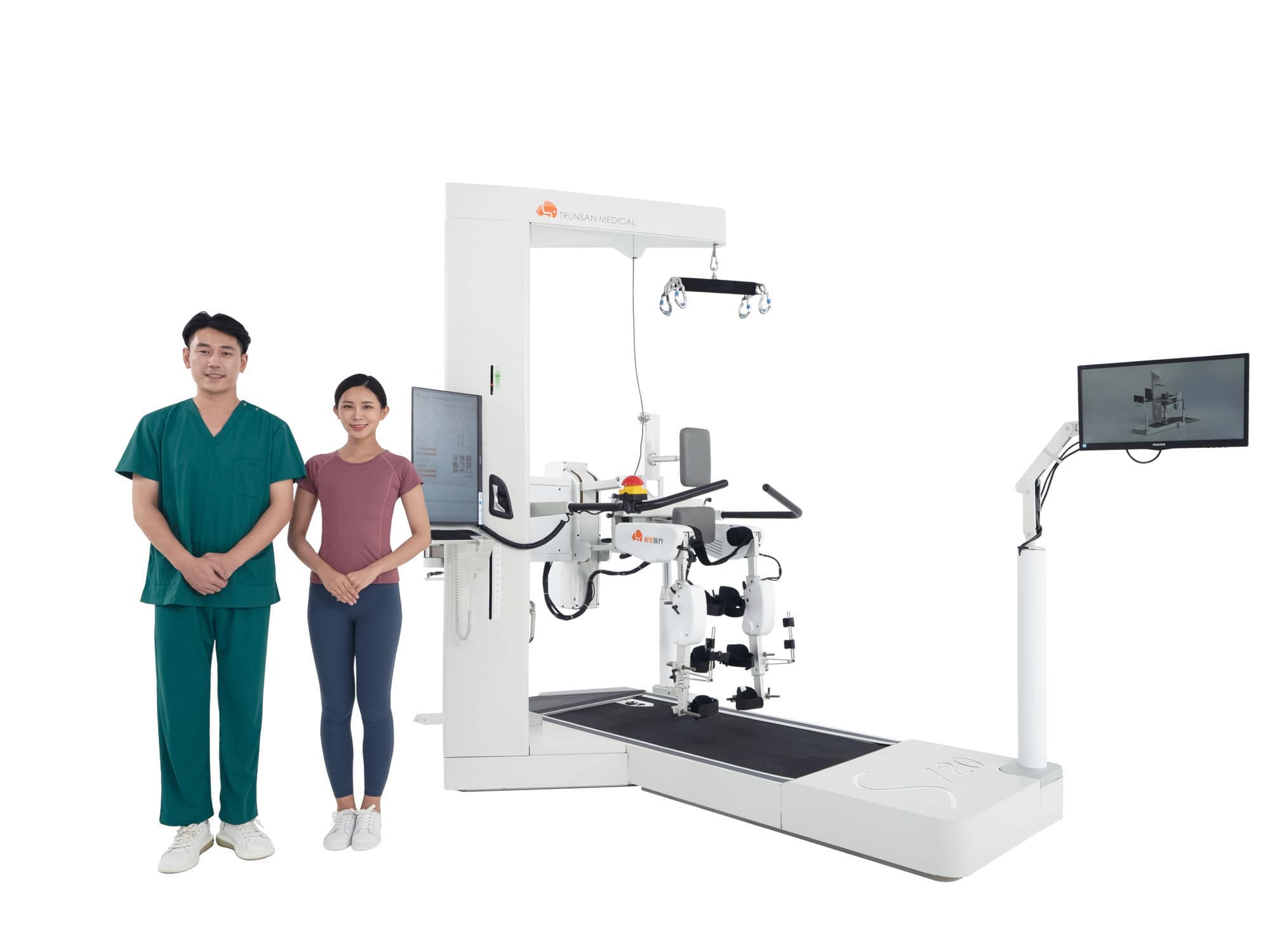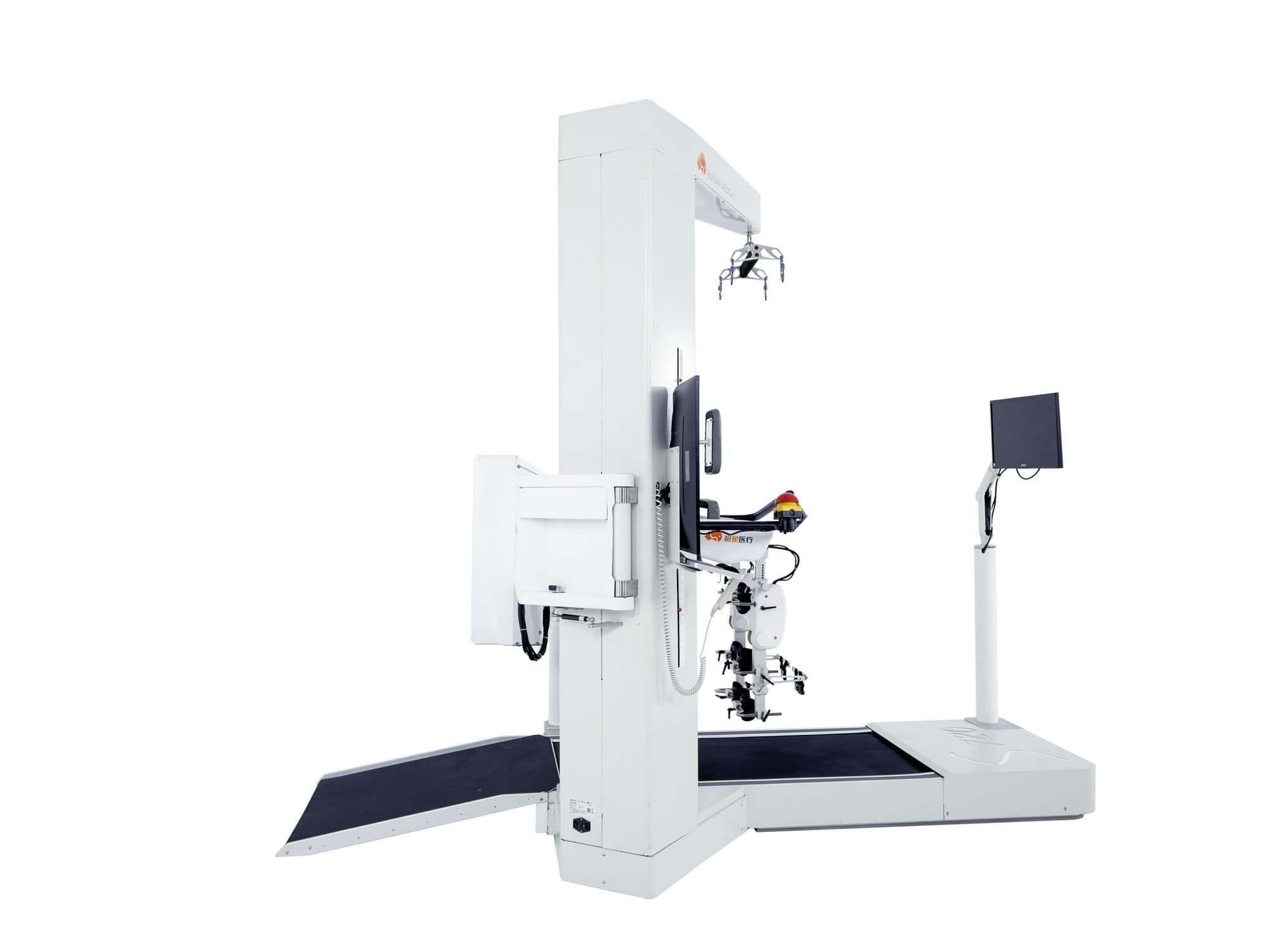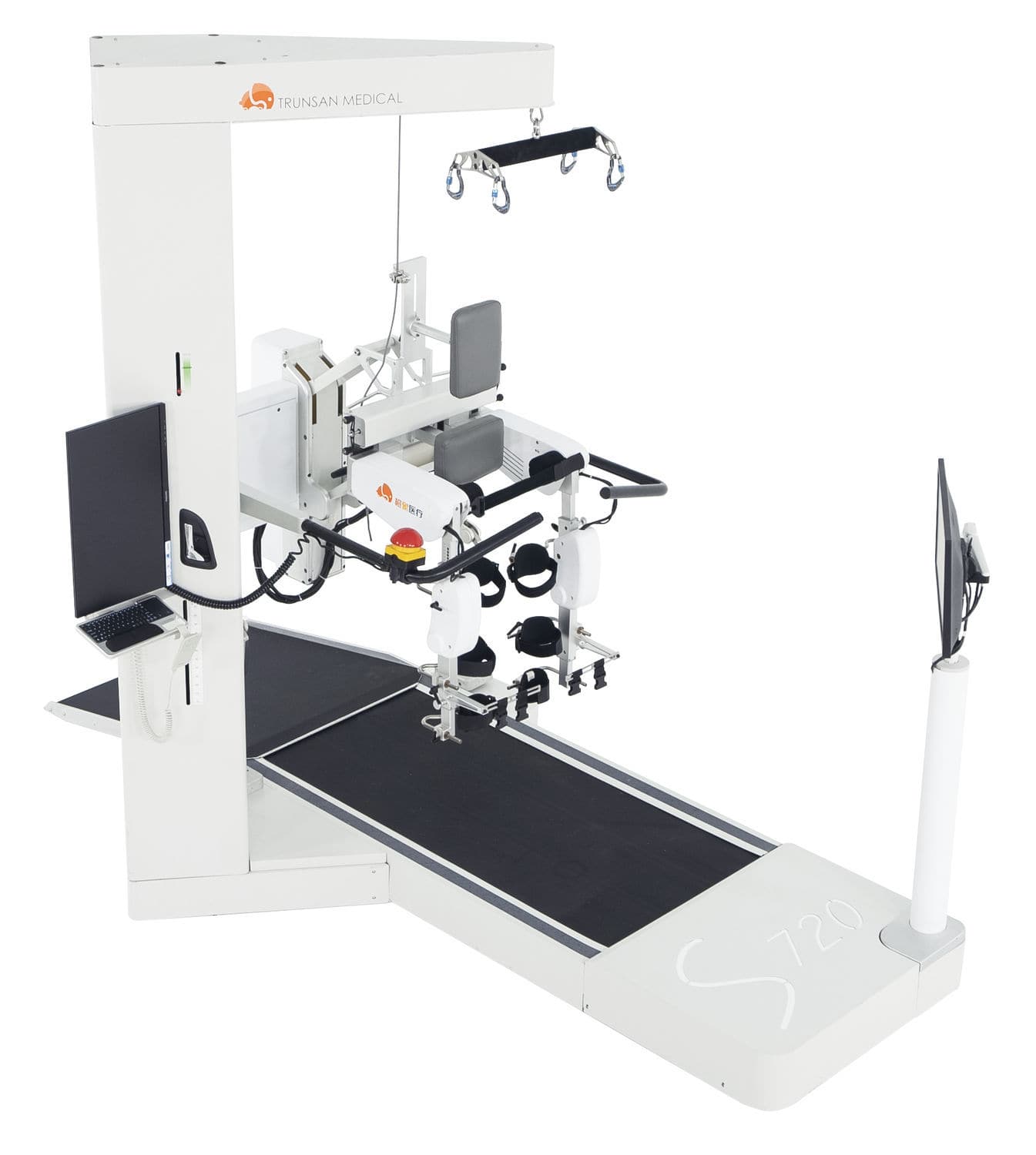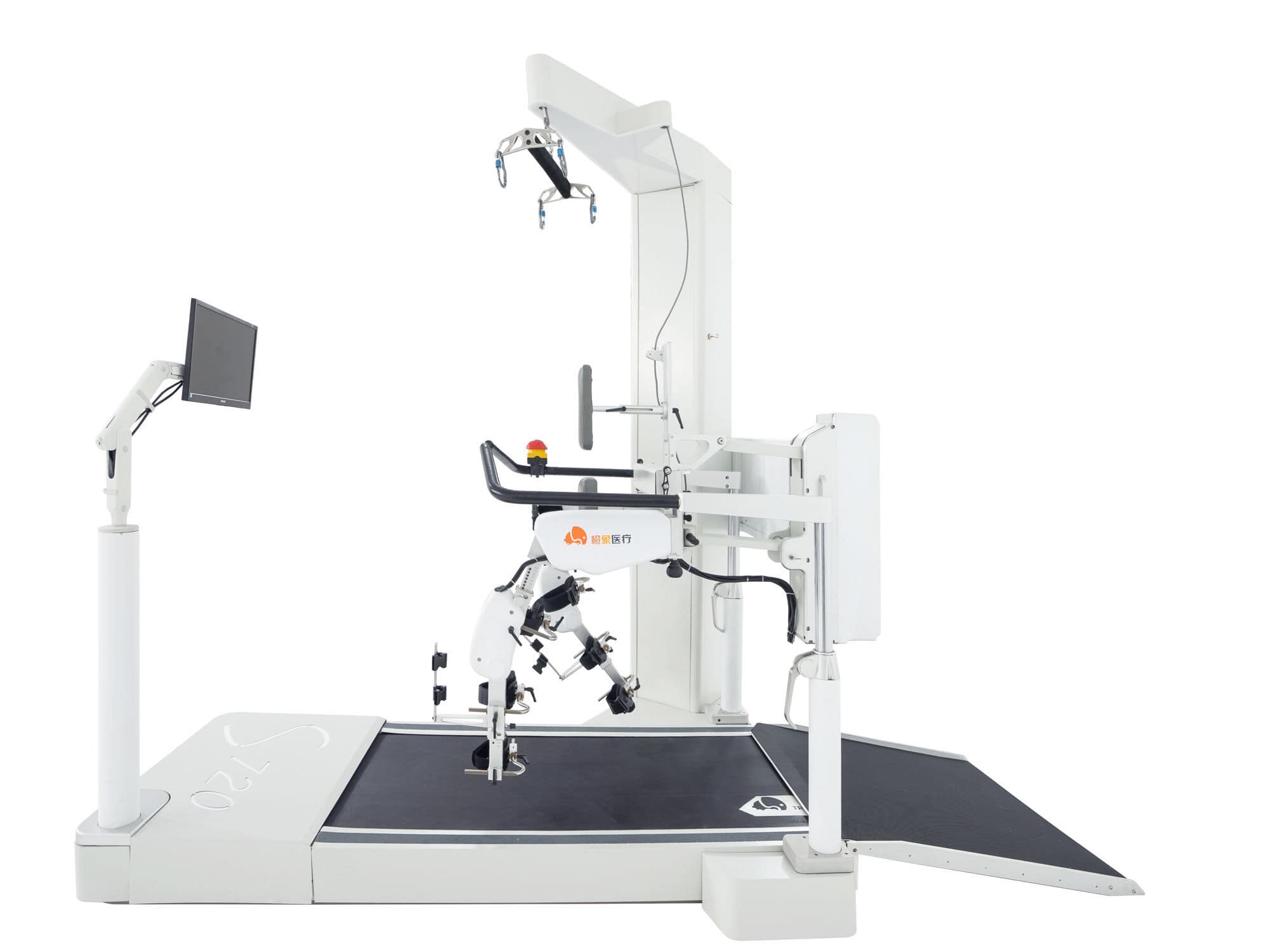 Structure and composition of S720 Robot-assisted gait training system: lt consists of gaitcontrol device, weight reduction support device, treadmill, waist belt (one set), legstraps (three sets) and proprietary software.