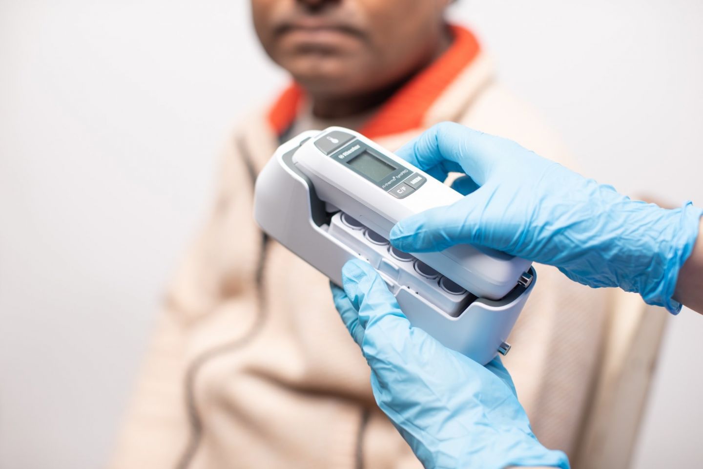 ri-thermo® tymPRO+ is a tympanic thermometer which measures temperature with single-handed operation and single-use probe covers to minimise the risk of cross-contamination. The measurement is easy to read on the LED display screen in both dark and light settings.