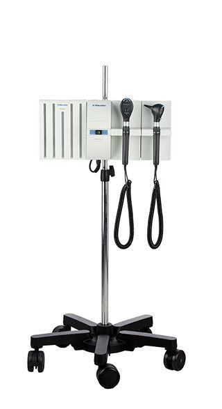 Mobile base is made of higher-quality stainless steel pole, which is height adjustable (105 – 130 cm / 41.3 – 51.2 in), is easy to move due to low friction, anti-static, lockable castors. Diameter (54 cm / 21.3 in). It comes with 2 handles and ri-spec ear specula dispenser.
