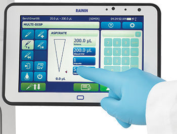 - The touchscreen display offers precision control over aspiration, dispensing, tip loading and ejection
